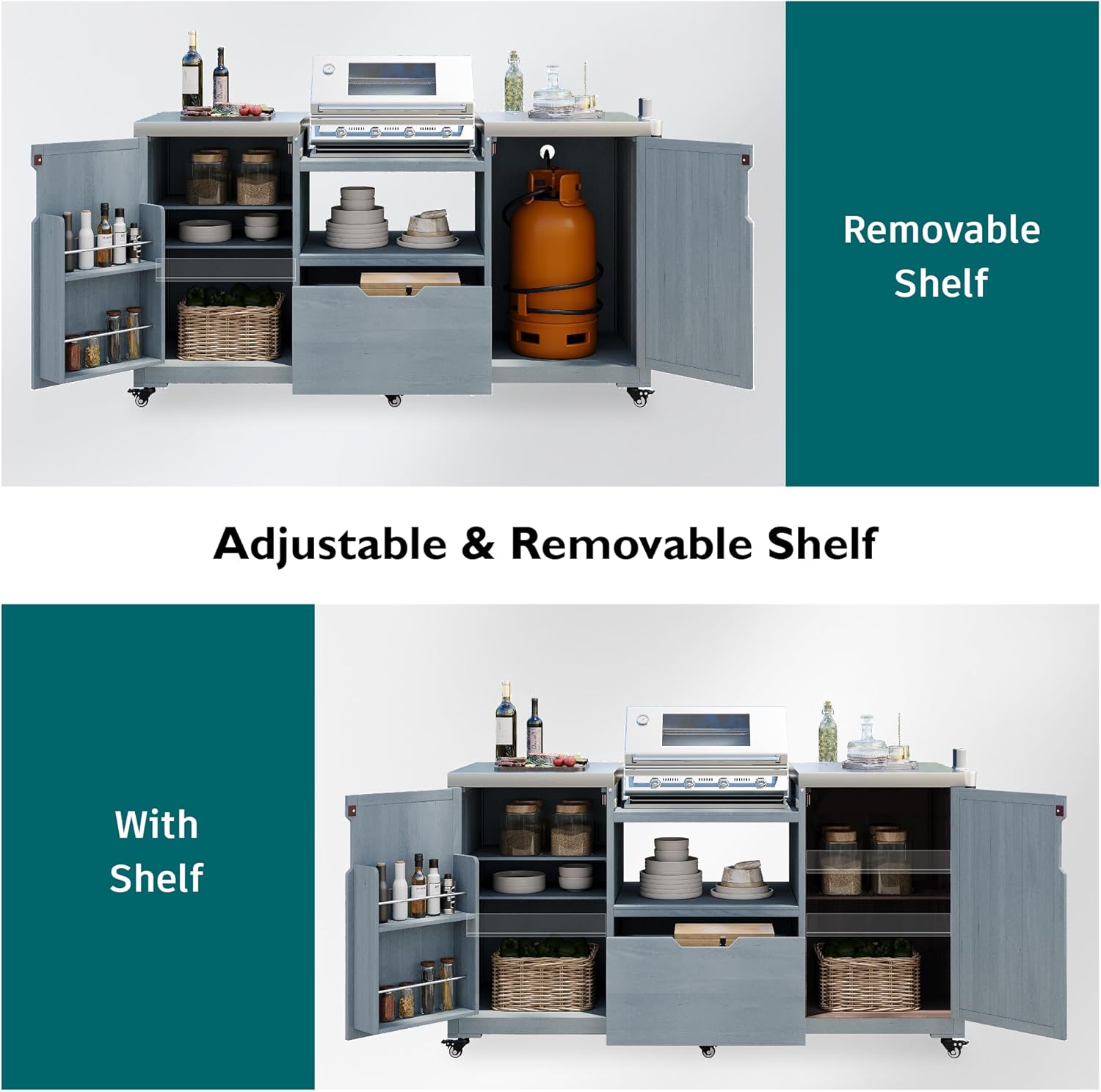 - [Optimal Workspace] The outdoor grill cart features a spacious central drawer, two cabinets and two 18.5β x 23β stainless steel tables at each end. By placing the middle adjustable shelf on top, you can connect them to create a large 60β x 23β table with a total work area of 1380 sq inches, ideal for any outdoor use. If you wish to utilize a gas grill on top and store a gas cylinder within the full cabinet, you can safely route the gas line through the exit hole for an optimal setup.