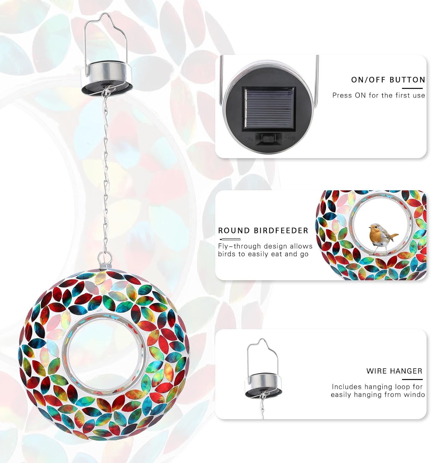 - Stunning Mosaic Artistry: Handcrafted glass mosaic bird feeder create a dazzling 8" orb. Includes sturdy hanging chain to display this functional art piece where sunlight dances across its surface - ideal for gardens, balconies, or porch overhangs