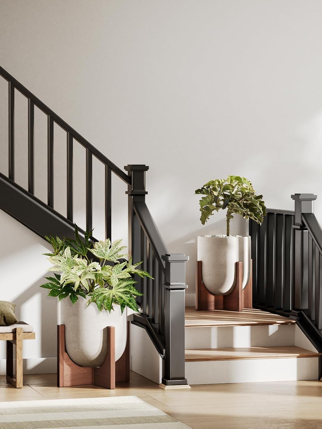 - Premium Ceramic and Wood: Our 12 inch pot for plants is crafted from durable ceramic and paired with a sturdy acacia wood stand; The white exterior features a satin finish that complements the wood grain, creating a minimalist and elegant aesthetic; And the unglazed interior provides a suitable environment for optimal growth