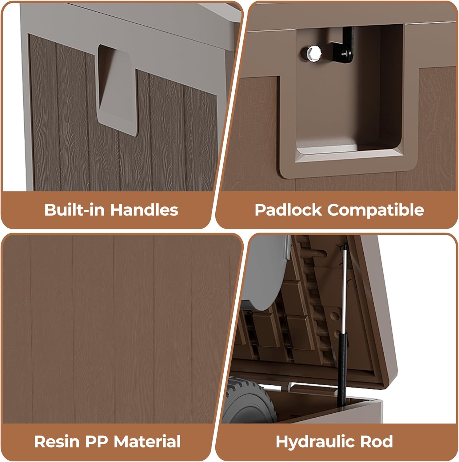 - Thoughtfully Designed for Maximum Convenience: Equipped with a pair of gas rods, this deck storage box opens smoothly and closes gently, eliminating the risk of pinched fingers. Ergonomic side handles are incorporated on both sides, facilitating effortless lifting and relocation. For added security, you have the option to attach a password lock or a small lock (not included) to the top cover, ensuring your stored items are protected