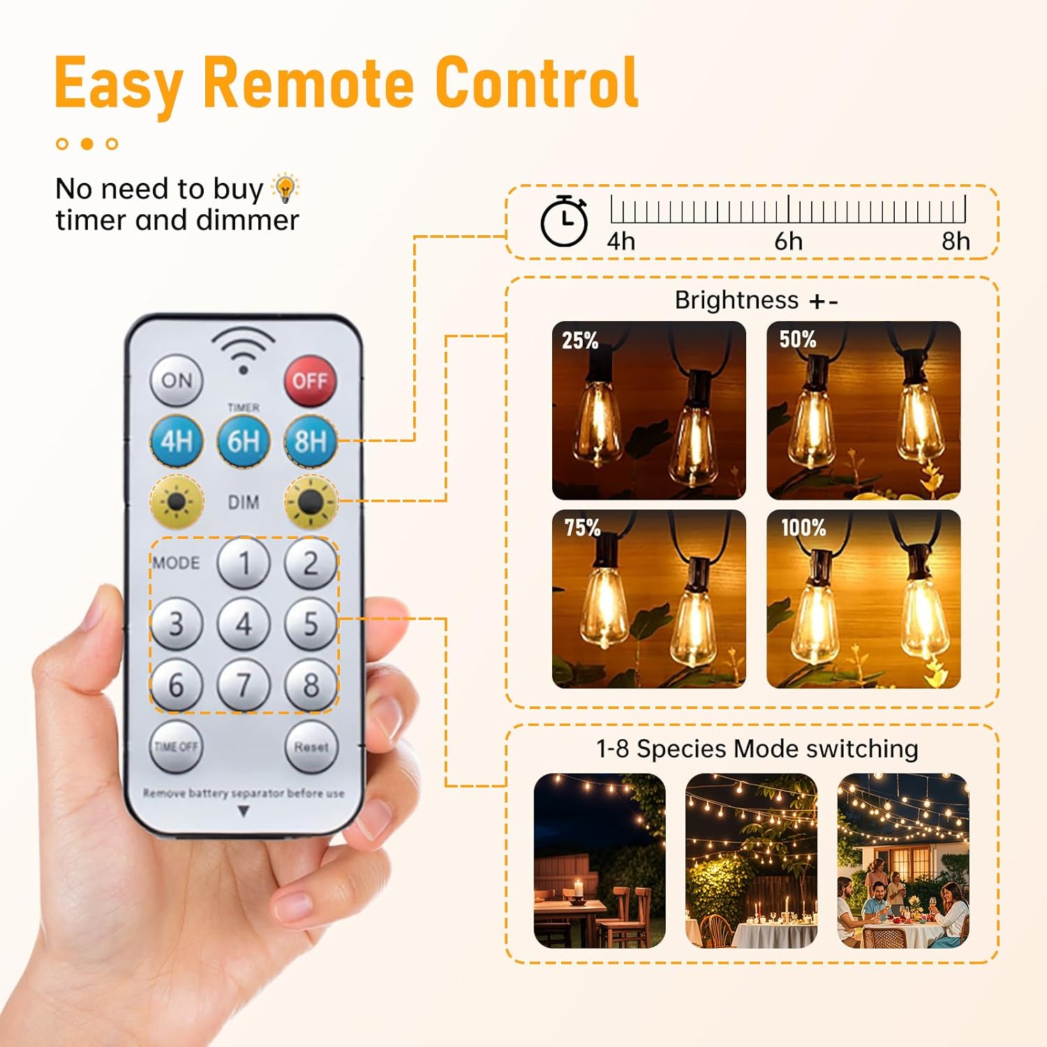 Solar String Lights Outdoor Waterproof, 100FT Solar Powered Outdoor Lights with Remote, 52 Shatterproof with Edison Bulbs, LED String SolarLights for Garden, Backyard, Parties