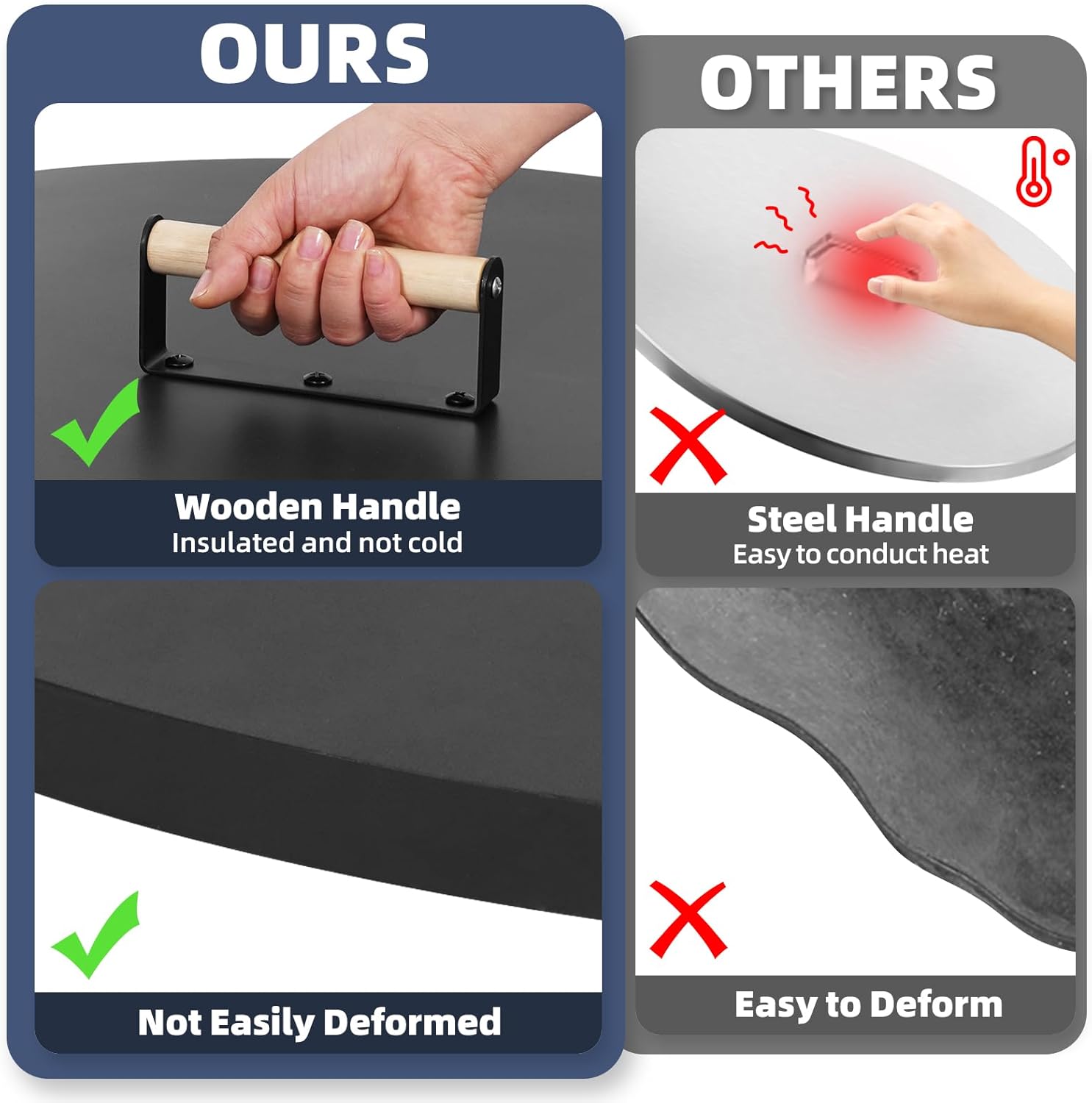 - ERGONOMIC WOODEN HANDLES FOR SAFE AND EASY HANDLING-Featuring lightweight, ergonomic handles made of durable wood, this fire pit lid round allows for smooth, effortless lifting and moving, ensuring safety and convenience. The Fire pit metal lid rounded edges protect against accidental injuries. This thoughtful design ensures a safe and convenient user experience, making it perfect for all your fire pit needs