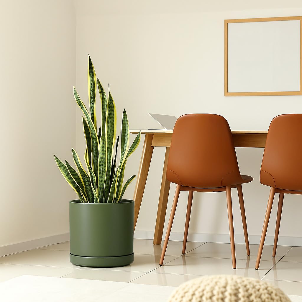 D'vine Dev 12 Inch Ceramic Planter Pot with Drainage Hole and Saucer, Indoor Cylinder Round Planter Pot, Olive, 94-O-F-J