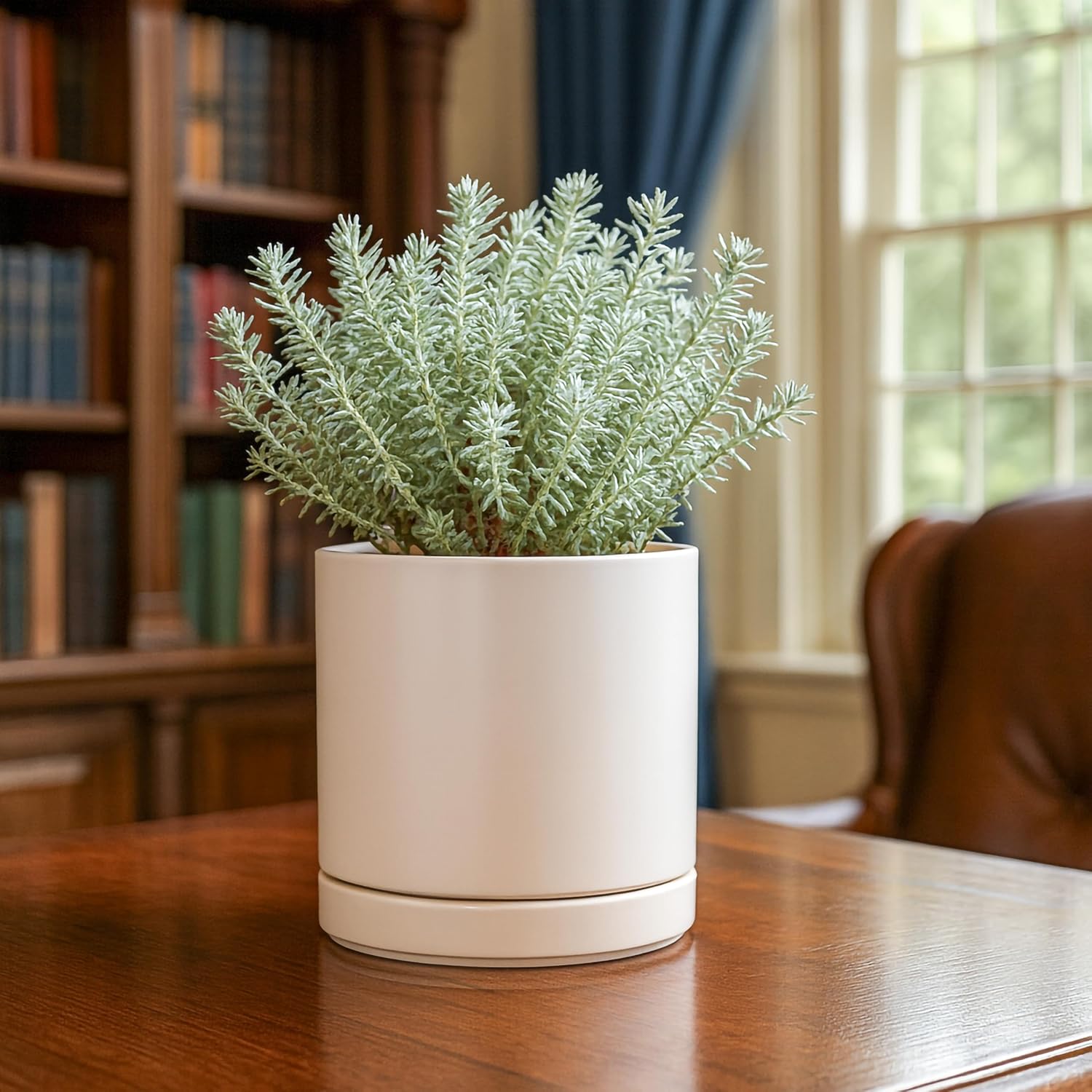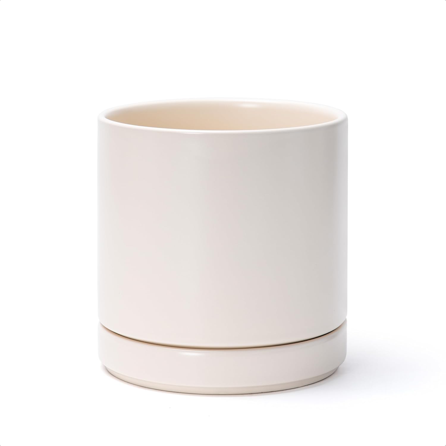 D'vine Dev 6.5 Inch Ceramic Planter Pot with Drainage Hole and Saucer, Indoor Cylinder Round Planter Pot, Oatmeal, 94-O-C-8