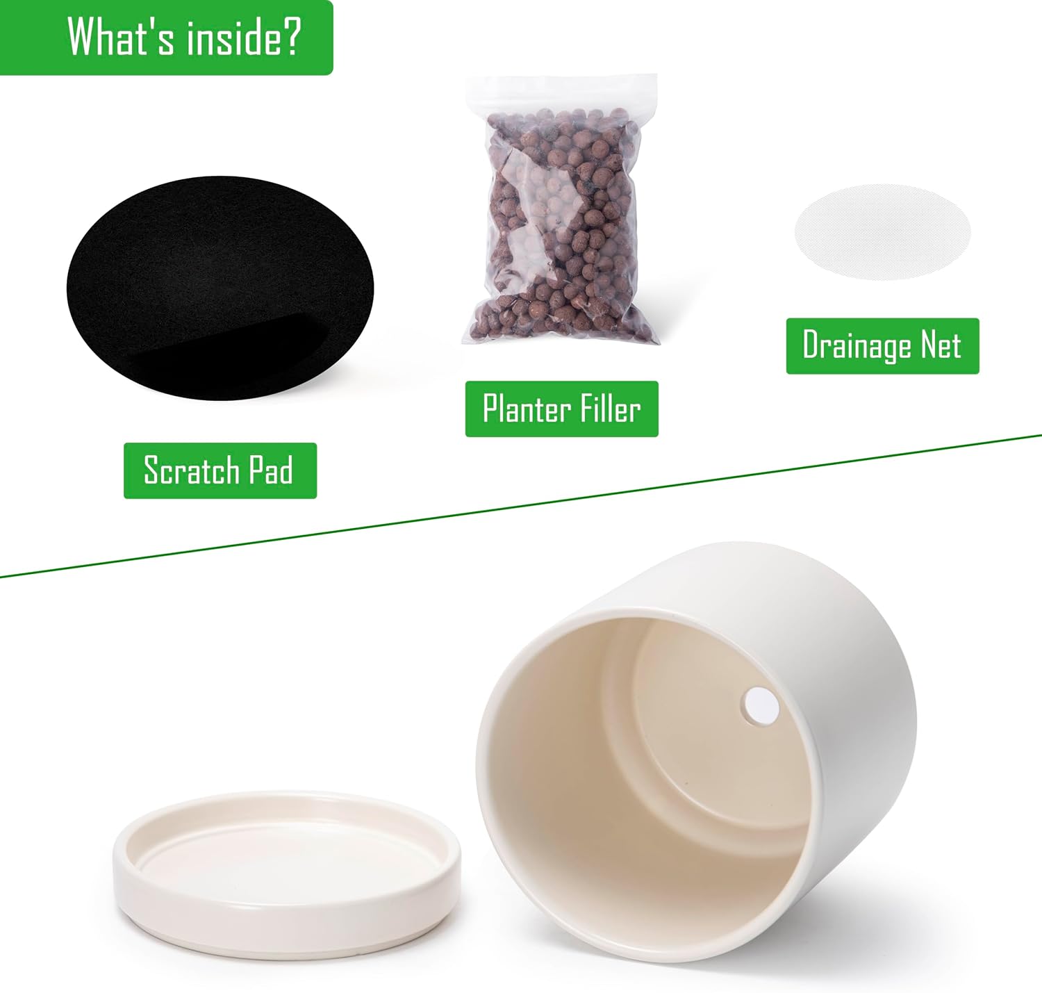 - Planter pot with drainage hole, mesh drainage net and protective scratch pad included.