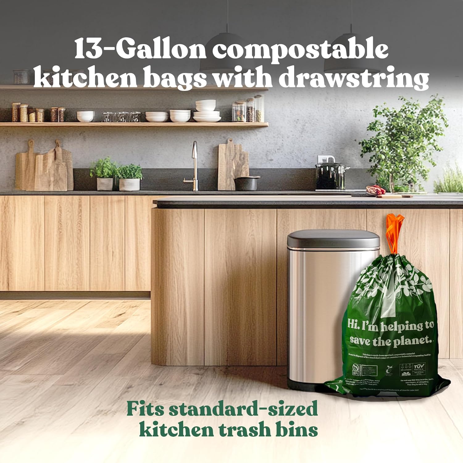 Healthy Earth 13 Gallon Compostable Trash Bags β Tall Kitchen Garbage Bags with Drawstring Handles, Extra Thick Plant-Based Liners, BPI & TΓV Certified ASTM D6400, Heavy Duty Leak-Proof (60 Count)
