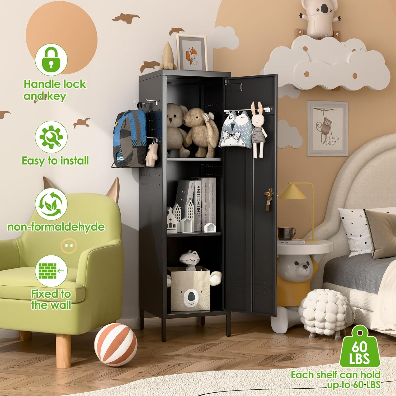 Metal Lockers for Employees with Handle,Metal Storage Locker with 2 Pegboard & 5 Hooks for Gym, School, Office,Home,Garage,Black