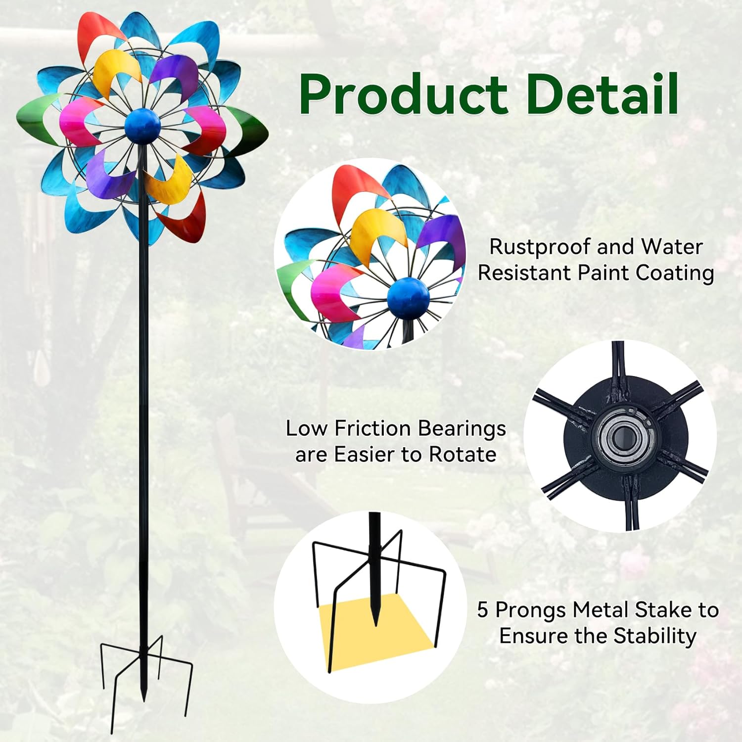 - Smooth Rotation with Low Friction Bearings: Equipped with low-friction bearings, this windmill for yard spins effortlessly even in light winds, creating a mesmerizing effect. Its design allows for smooth, continuous movement, enhancing your outdoor decor with ease and style.