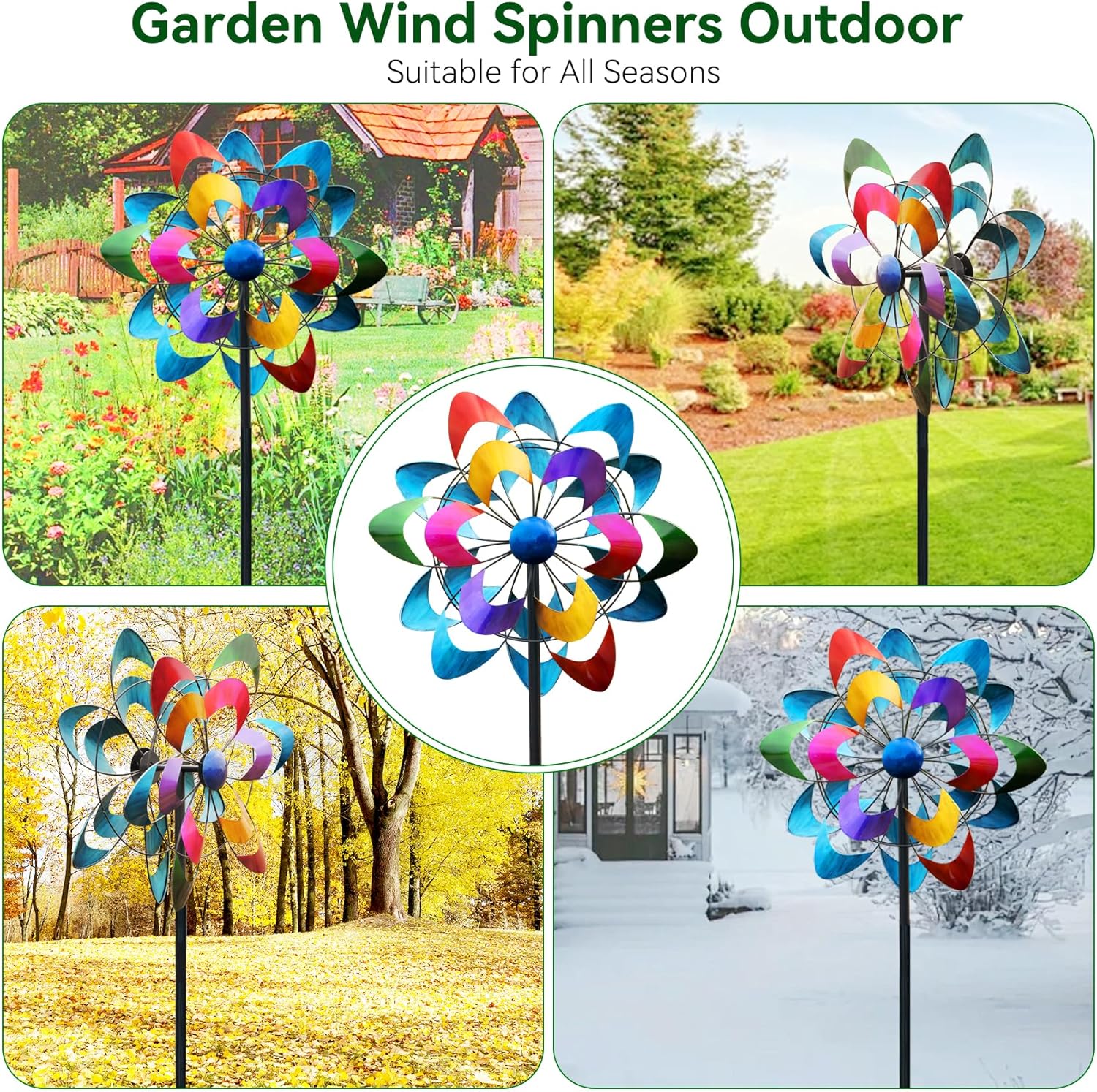 - Vibrant Colorful Outdoor Wind Spinner: This large kinetic wind spinner features two blades with a six color design, creating a dazzling display of vibrant colors when it rotates. Watch it spin and bring your yard to life with every breeze.