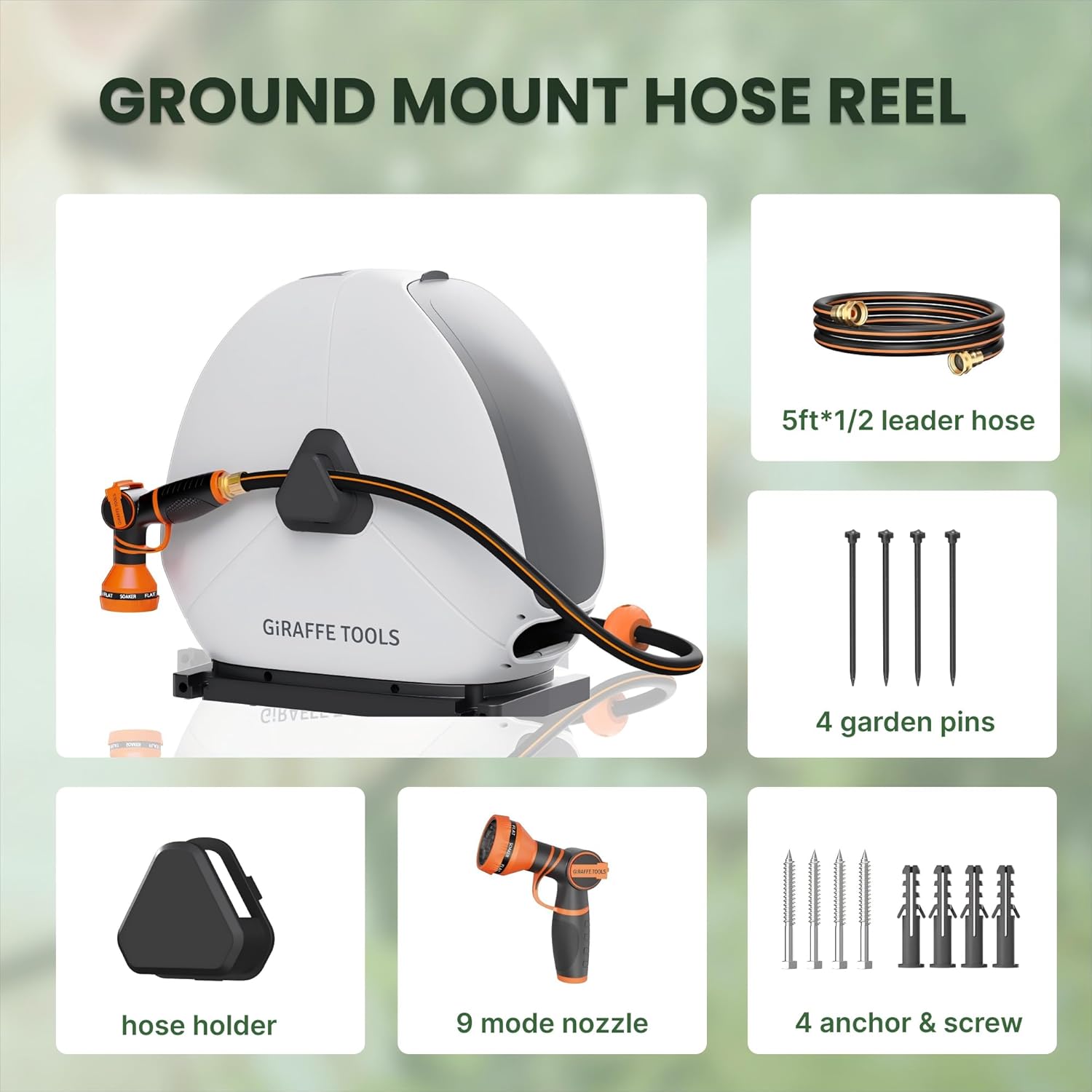 Giraffe Tools Retractable Hose Reel with 1/2 Inch x 100FT, Heavy Duty Ground Mount Garden Hose Reel, Automatic Rewind,with 9-Function Sprayer Nozzle & Flexible Swivel Base