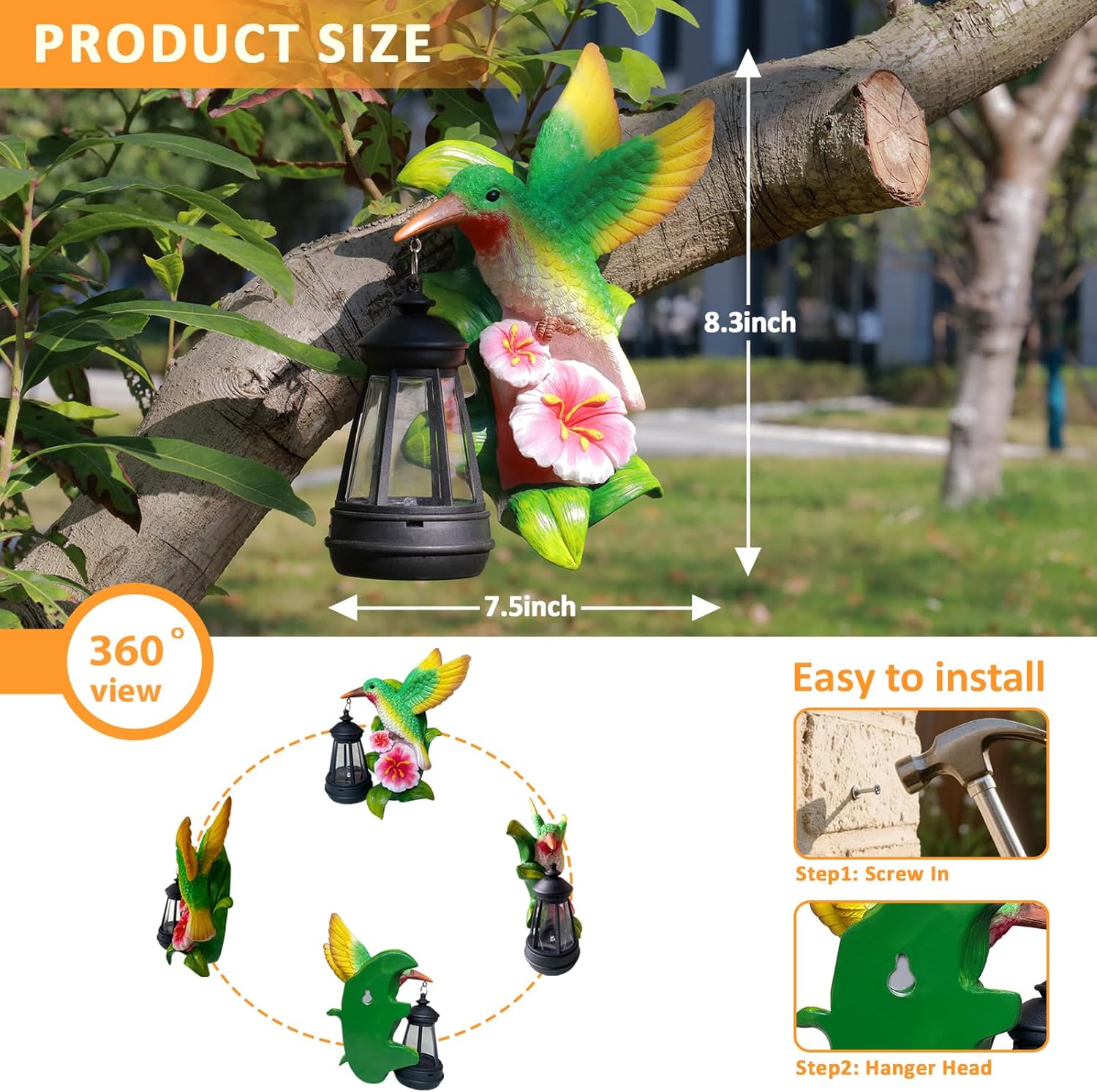 - Unique Design: The cheerful hummingbird spreads its wings and stands on the flower, holding a solar light in its beak, which is very vivid and cute. Size: 8.3" H x 7.5" W x 2.7" D inch. This solar hummingbird statue is sure to bring joy to any space. Why not hang it on a wall, in a tree, or in your yard, Fence, patio, or garden? Create a warm and comfortable atmosphere.