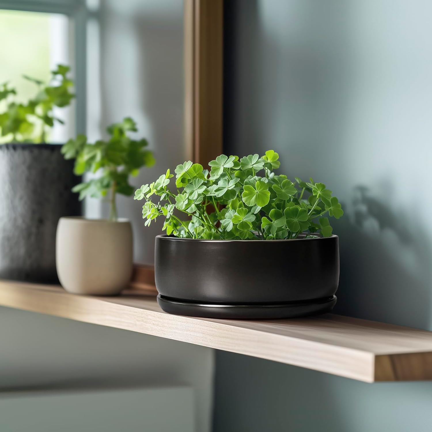 SQOWL Bonsai Pots - 8 Inch Ceramic Plant Pots for Succulents, Round Indoor Planter with Drainage Hole and Saucer, Shallow Modern Planter Bowl, Room Decor, Black