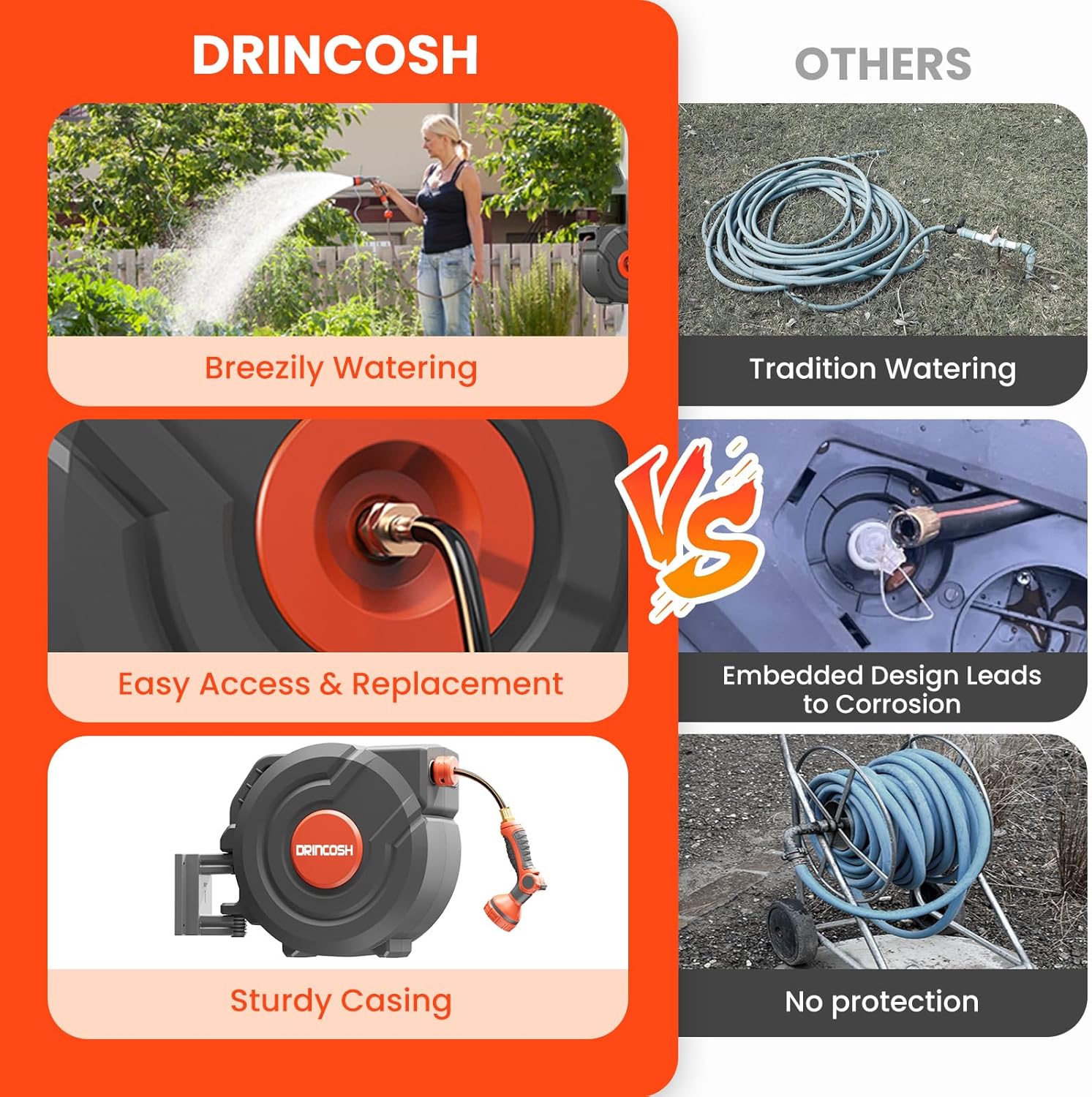 - 【20,000+ Retraction Tests & All-Weather Protection】DRINCOSH hose reels for outside has undergone over 20,000 retraction tests, ensuring long-lasting and reliable performance. Its outer casing is made from UV- and freeze-resistant materials, providing superior protection against harsh weather conditions while preserving its functionality and appearance