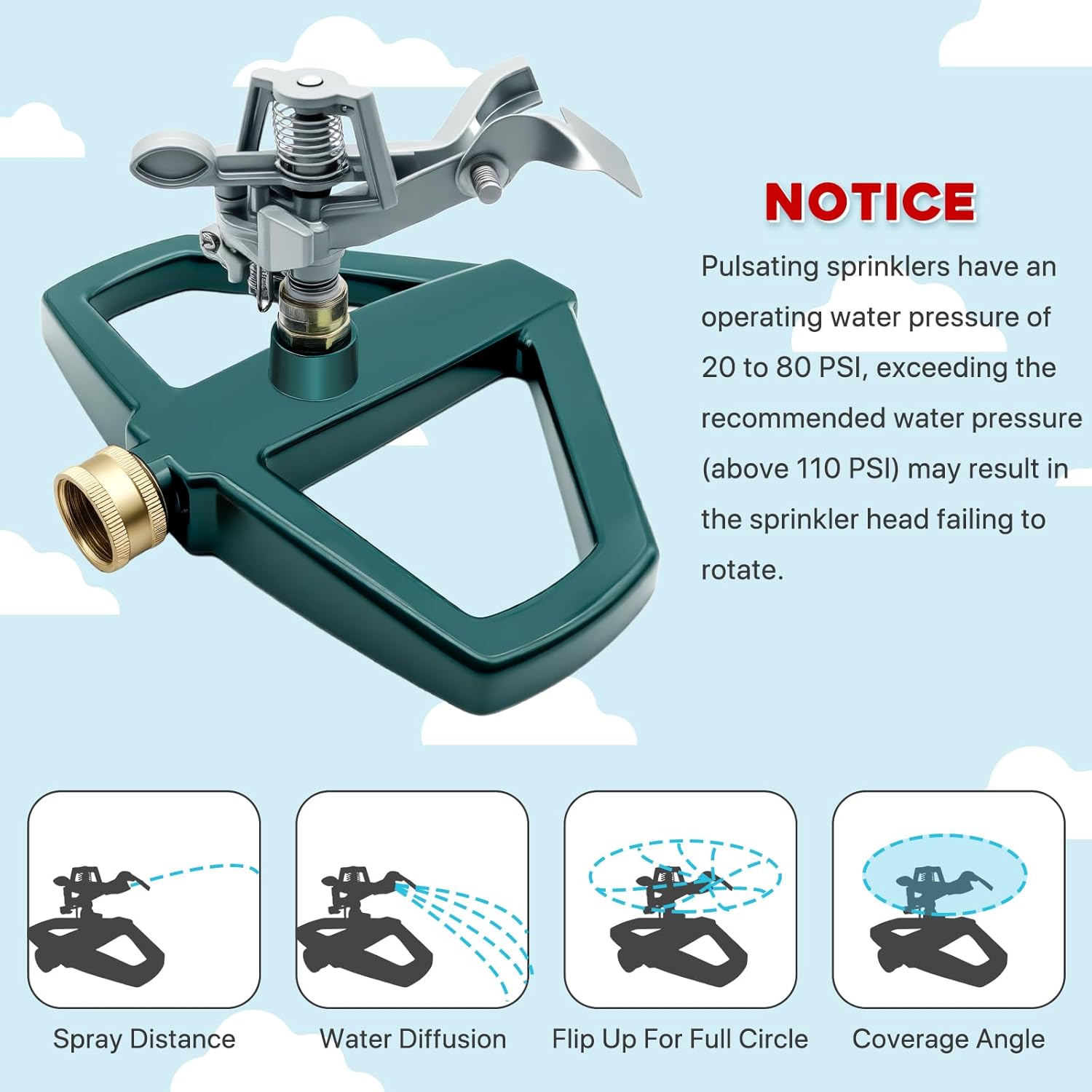 - 【Efficient Water Conservation and Uniform Irrigation】Pulse spray technology ensures even water distribution and reduces water waste. lawn sprinkler suitable for lawns, gardens and large areas, pulsating sprinkler with metal base helping you easily maintain a green and healthy outdoor space. The sprinkler itself has a swivel connection to the hose, ensuring both the sprinkler and the hose can lay flat when installing.