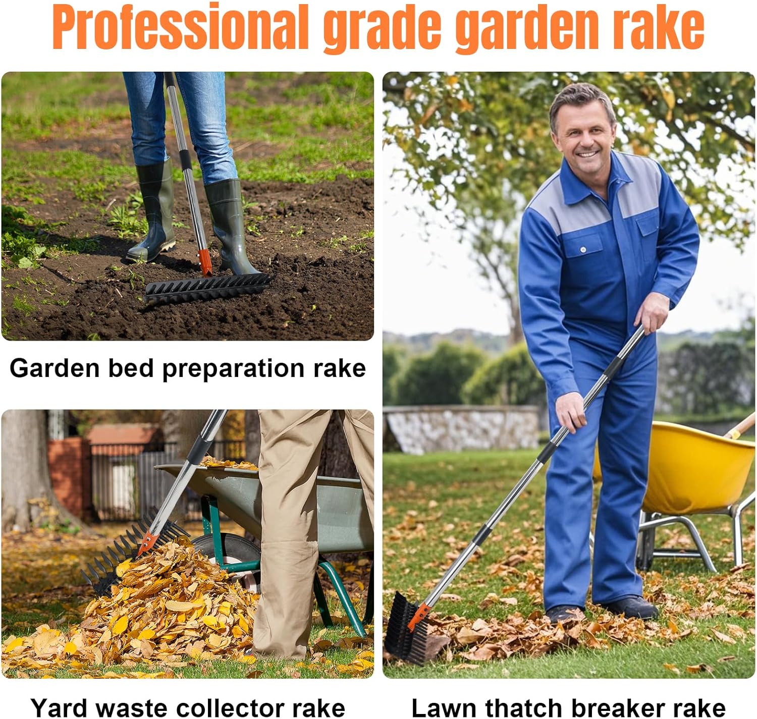 - 【Precision Thatch & Soil Management】 13-Tine Side (1" spacing): Optimized for raking leaves, pine needles, and shallow thatch in tight spaces like garden edges and drainage ditches. 16-Tine Side (0.78" spacing): Closer teeth penetrate 1.5" deep to breakup clay soil and aerate lawn roots after heavy rains.