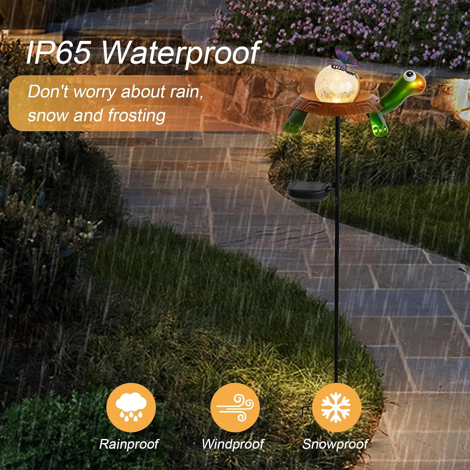 - Solar lights outdoor decorative are made from high-quality, durable metal & glass, the intricate cracked glass orb on turtle's back create a delicate yet eye-catching aesthetic, perfect for gardens decor