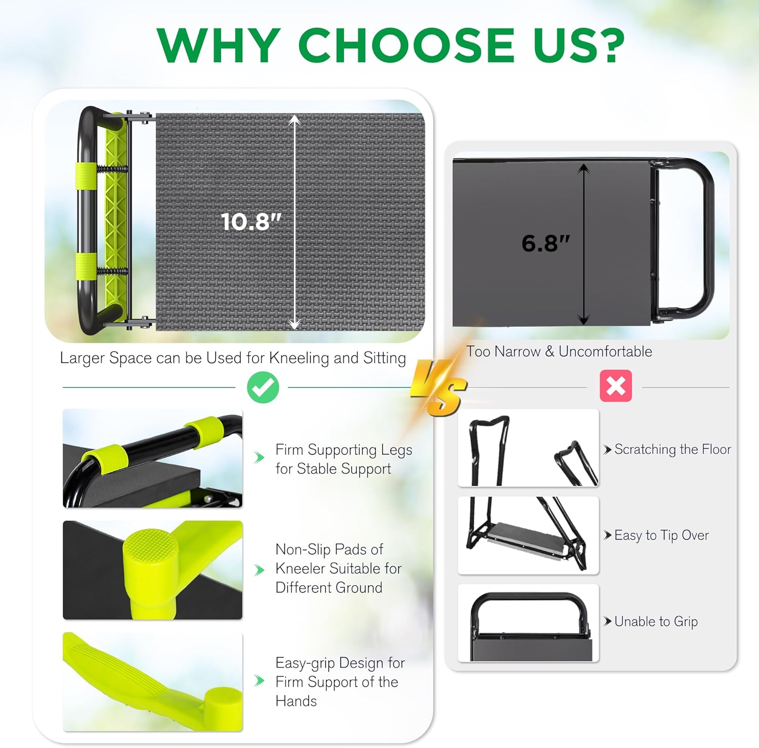 - 【10.8” Widened Seat】With a 10.8 inch wide cushion, this garden kneeler and bench can give you more support and comfort when kneeling or sitting on the stool. In addition, the equipped ergonomic handles not only make it easier to grasp and flip the gardening stool, but also provide your body with firm support when using this tool at an angle.