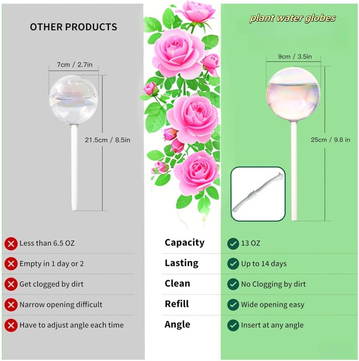 - Glass Watering Globes for Plants : Innovative rubber stopper with wick cord prevents clogging and ensures consistent slow released bottom watering without adjusting the angle. Hassle-free cleaning.
