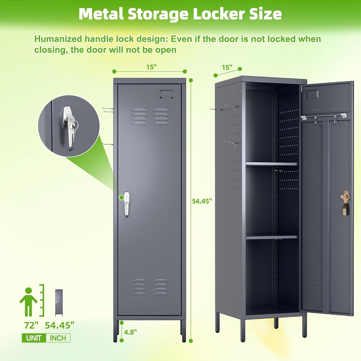 - 【Large Storage Capacity】1 door metal lockers for employees with Lock 15"D x 15"W x 54"H. Equipped with 5 hooks and 2 Pegboard,it can meet your needs for storing different sized items and meet most of your daily needs.