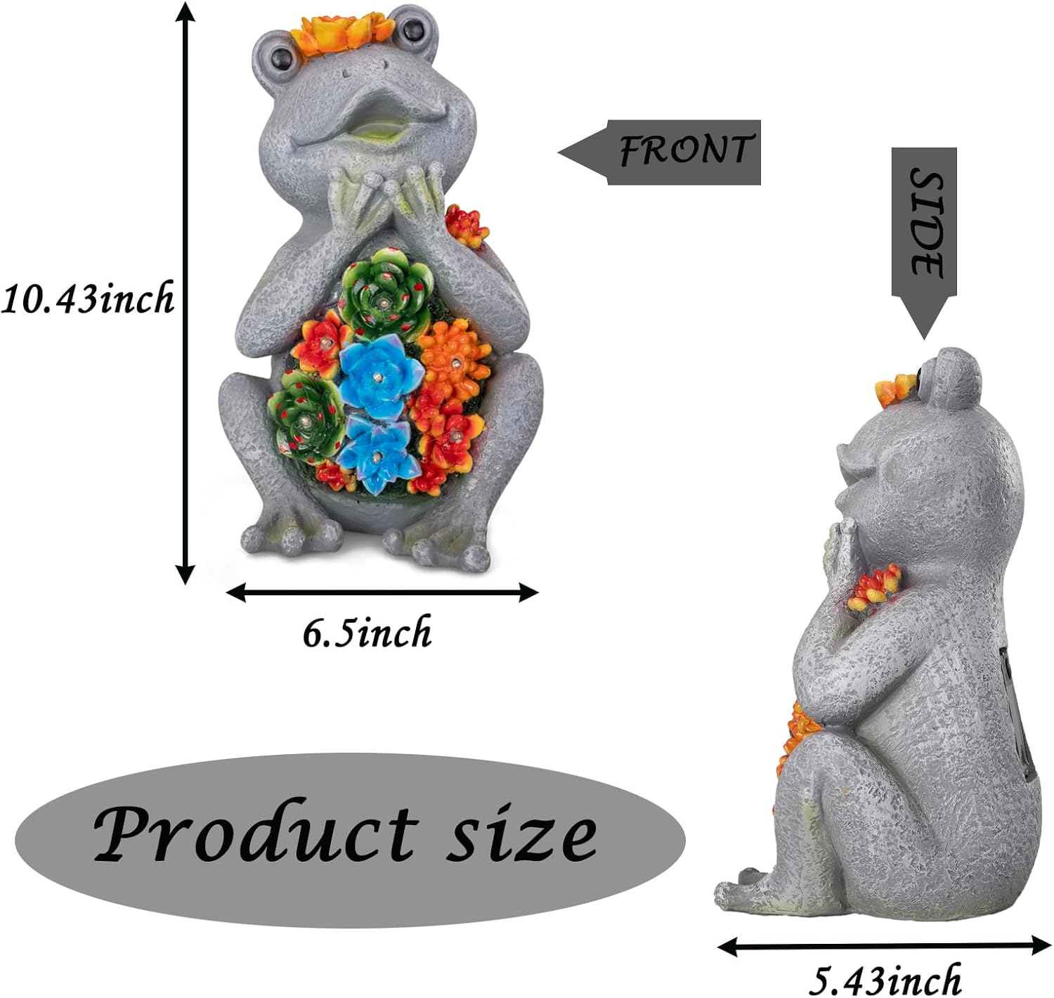 - 【Product Presentation】Frog Size: 6.5 "L x 5.43 "W x 10.43 "H. This frog figurines made of resin material, painted and finished with a UV resistant coating that can withstand heavy rain, snow or scorching sun without fading or rusting.