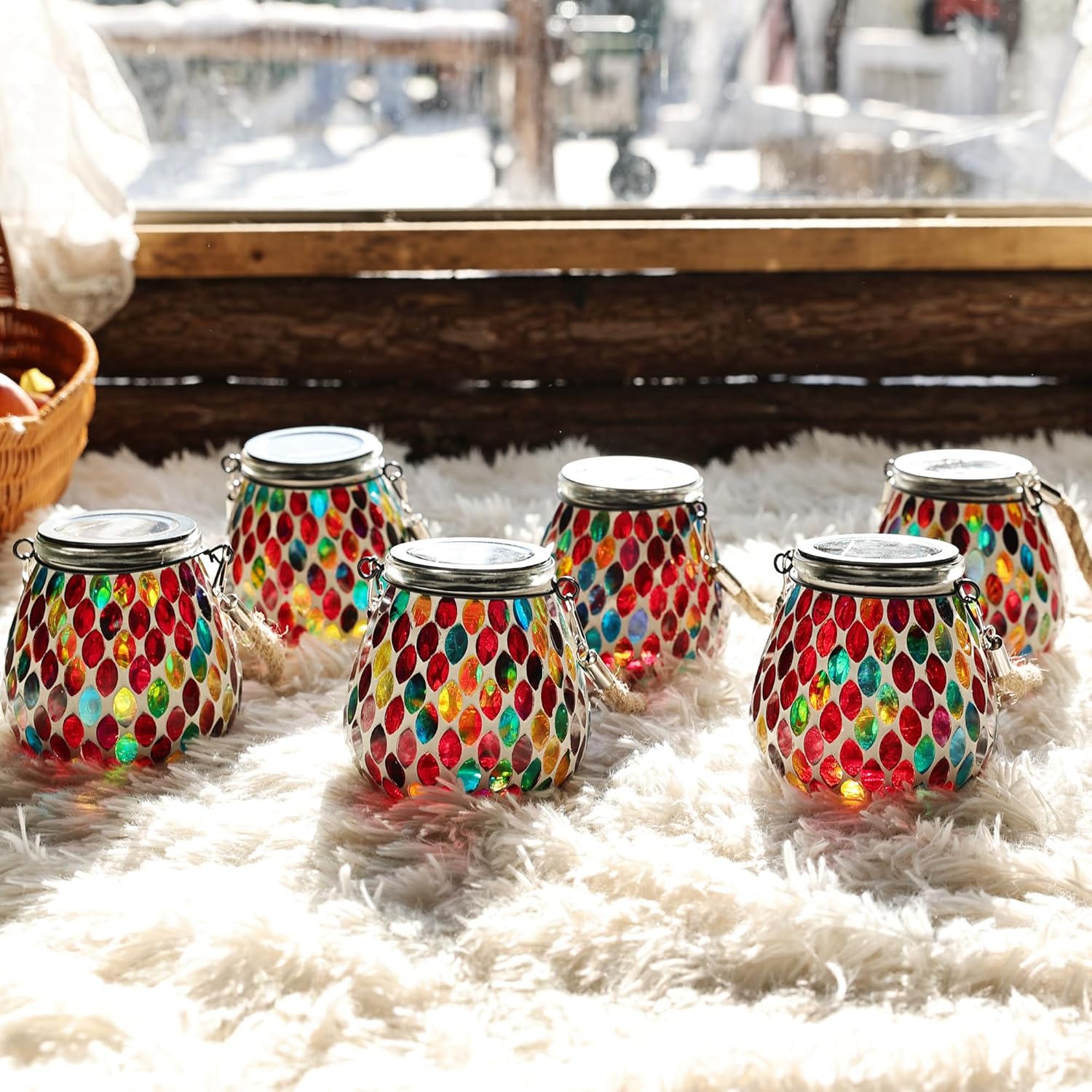 Cooo 4 Pack Mosaic Solar Lantern Outdoor Waterproof IP68 Hanging Projection Light Hidden Lid Pear-Shaped Lantern with Rope Handle Solar Powered Auto On for Patio Garden Fence Table - Crimson Ember