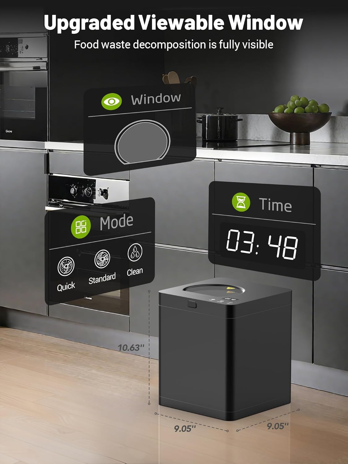 - Smart & User-friendly Design: Our kitchen composter featuring a intuitive LED display, ensures easy operation for all ages. With one-touch auto-clean function, say goodbye to manual scrubbing, save time and effort. The transparent viewing window lets you monitor progress and enjoy the fascinating transformation of waste into compost - like a mini science show in your kitchen!
