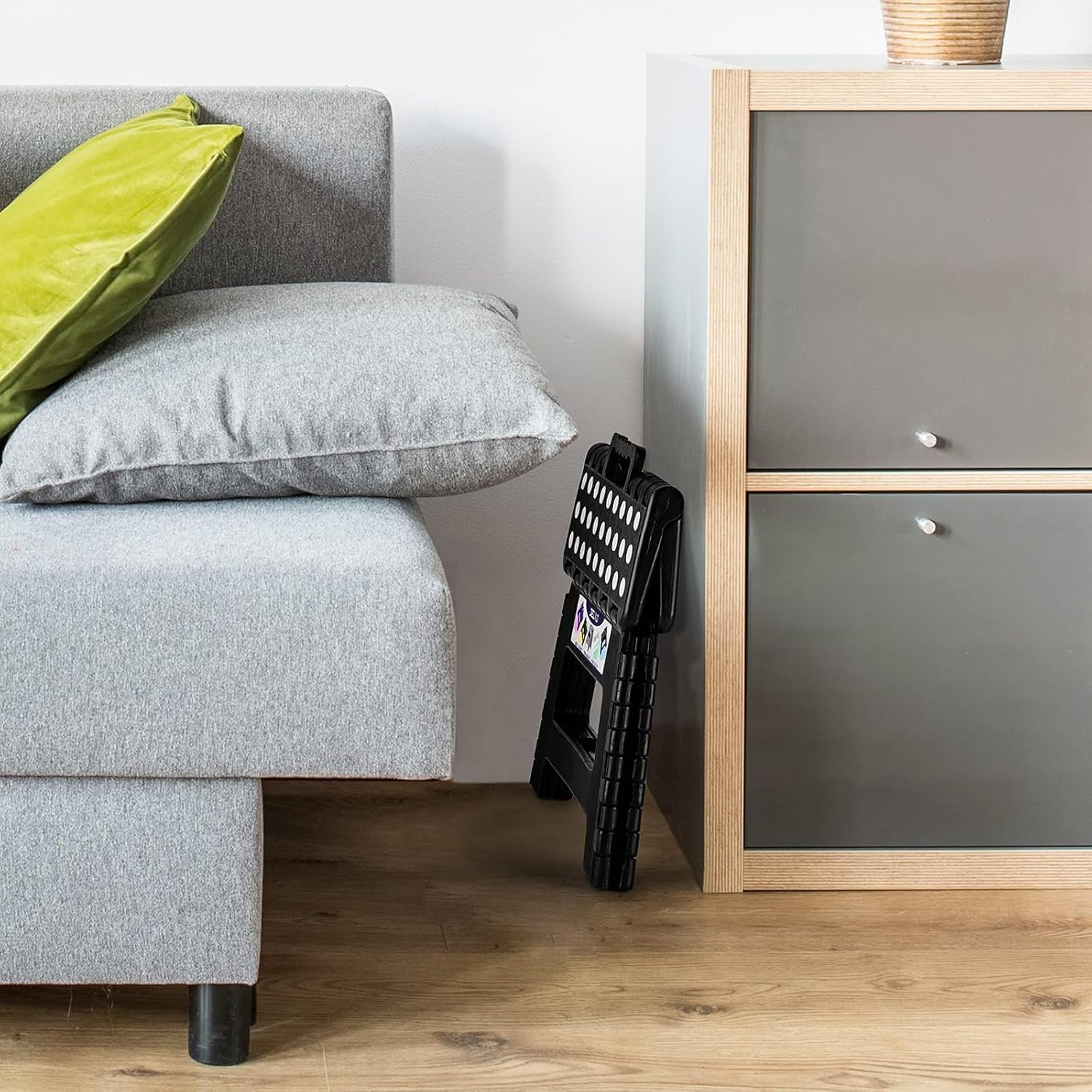 - Sturdy & Safe Black Foldable Step Stool : Our 9inch folding step stool is handy to have around for all sorts of occasions. Compact at 9"H Γ12.5"LΓ8.5"W when opened and 13.5"HΓ12.5"LΓ1"W when folded, this durable and strong plastic step stool can support up to 300lbs. It is lightweight and versatile, and can be used both outdoors and indoors in the kitchen, bathroom or office