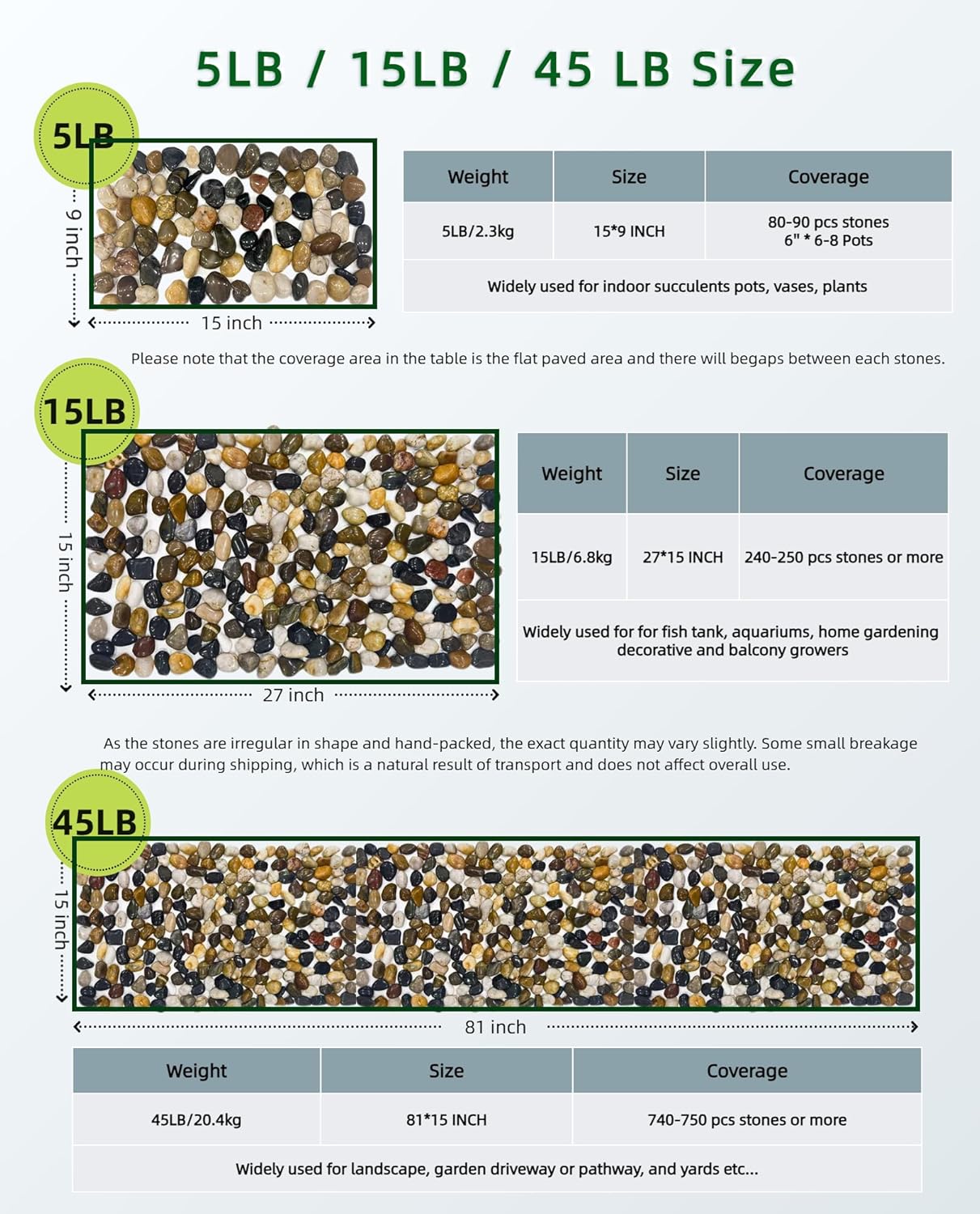- 【15LB Polished Mixed River Rocks – Natural & Decorative】 Each 15LB bag contains approx. 240-250 hand-selected, smooth river rocks, each stone sized about 1–2.2 inches. Mixed natural tones include white, brown, black, and beige......Ideal for adding texture and color to your space.
