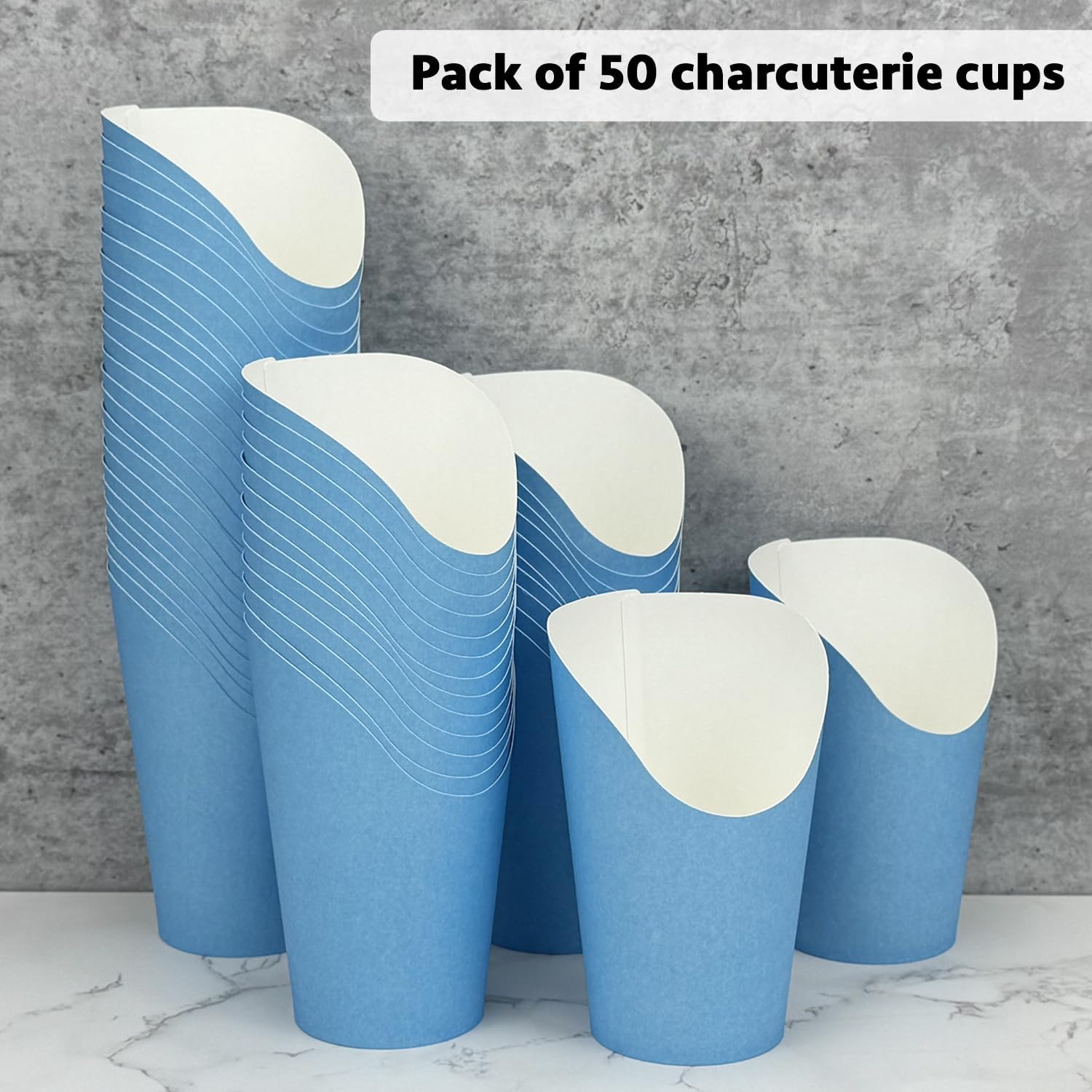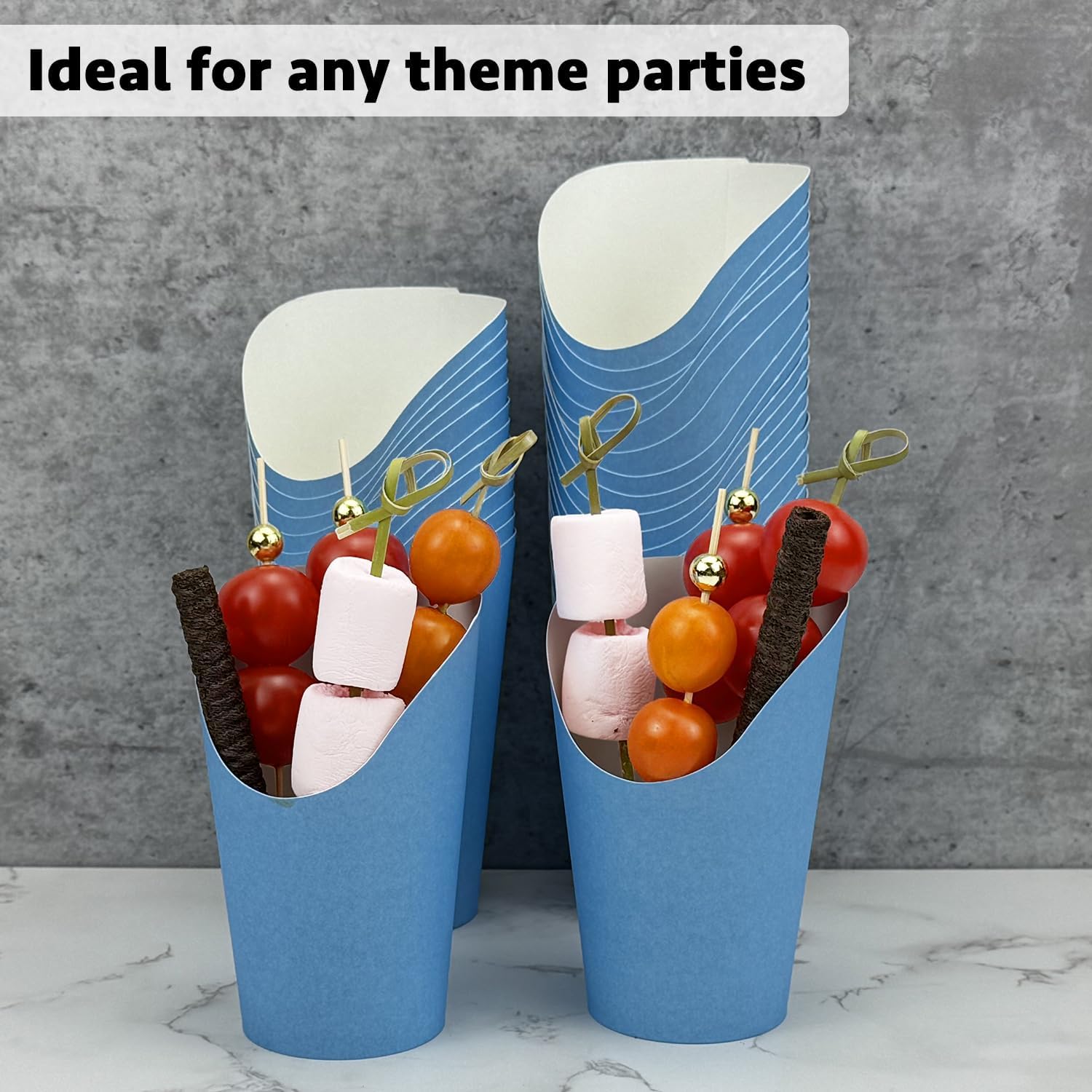 - [Ideal for Take Out Store or Any Theme Parties] - The classic blue paper cups goes well with many different venues and themes. Used as individual charcuterie cones for baby shower, bridal shower, party, wedding, birthday, event or picnics, anniversary, or event all festivals. The shape of party cups are ideal for displaying goodies. It surely doubles the fun rather than simple party goods.
