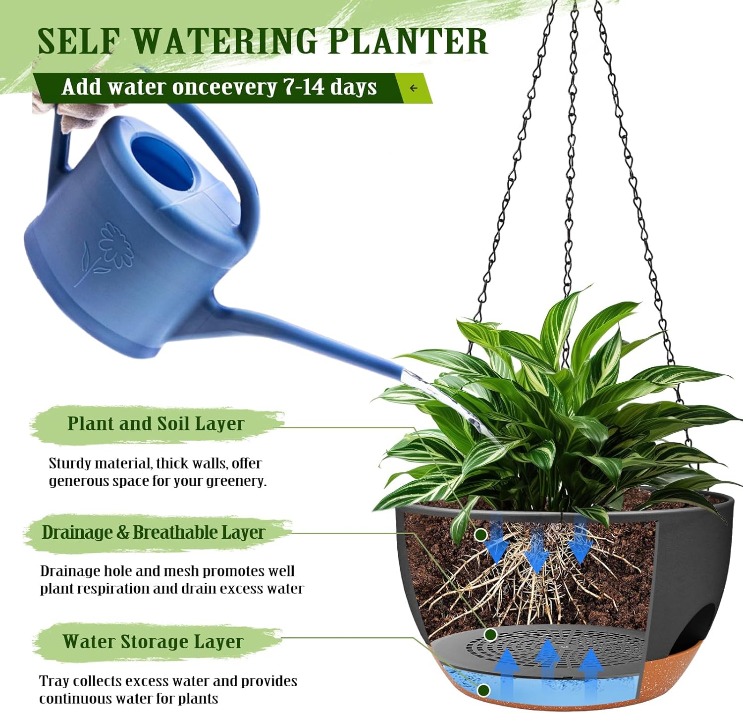 Hanging Planters for Outdoor Indoor Plants, 2 Pack 12 Inch Hanging Basket Plants Outdoor, Self Watering Hanging Planter with Plant Hanger for Garden Home Decoration (2 Type Plant Hangers Black)