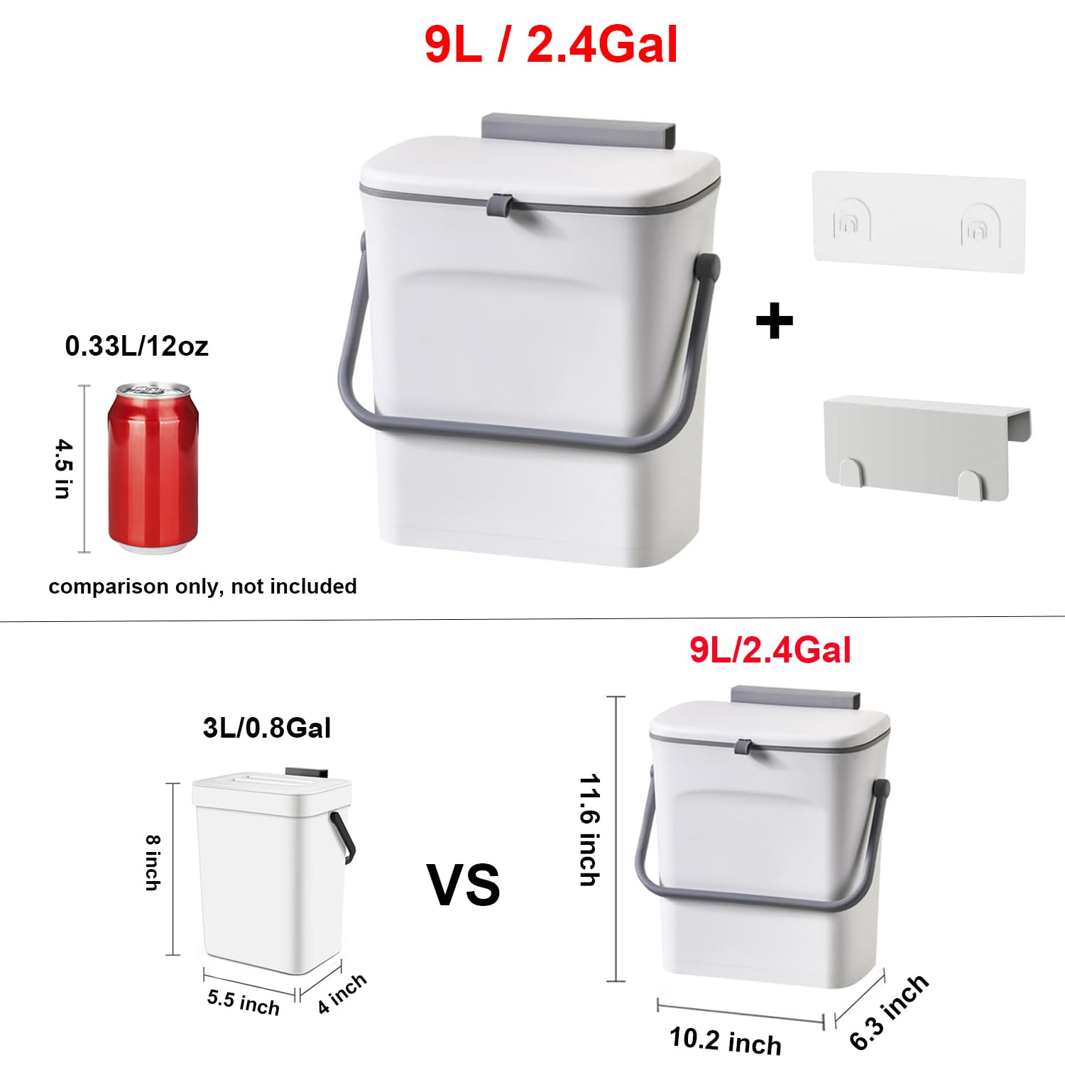 - Convenient Size: The wall composting is 9L/2.4 Gallon. 10.2" * 6.3" * 11.6". A slightly larger than the average countertop compost bins in the market, which will save your trip to the outside compost site.