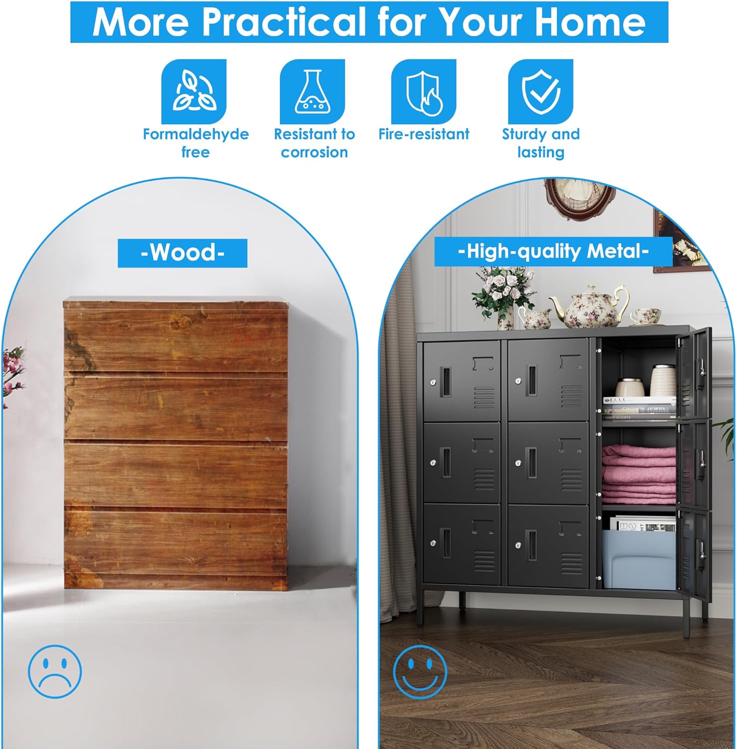 METAN Metal Locker with Padlock and Keys for School Office Gym Bedroom, 9 Doors Black Steel Storage Locker Cabinet for Employees Industrial Storage,Assembly Required