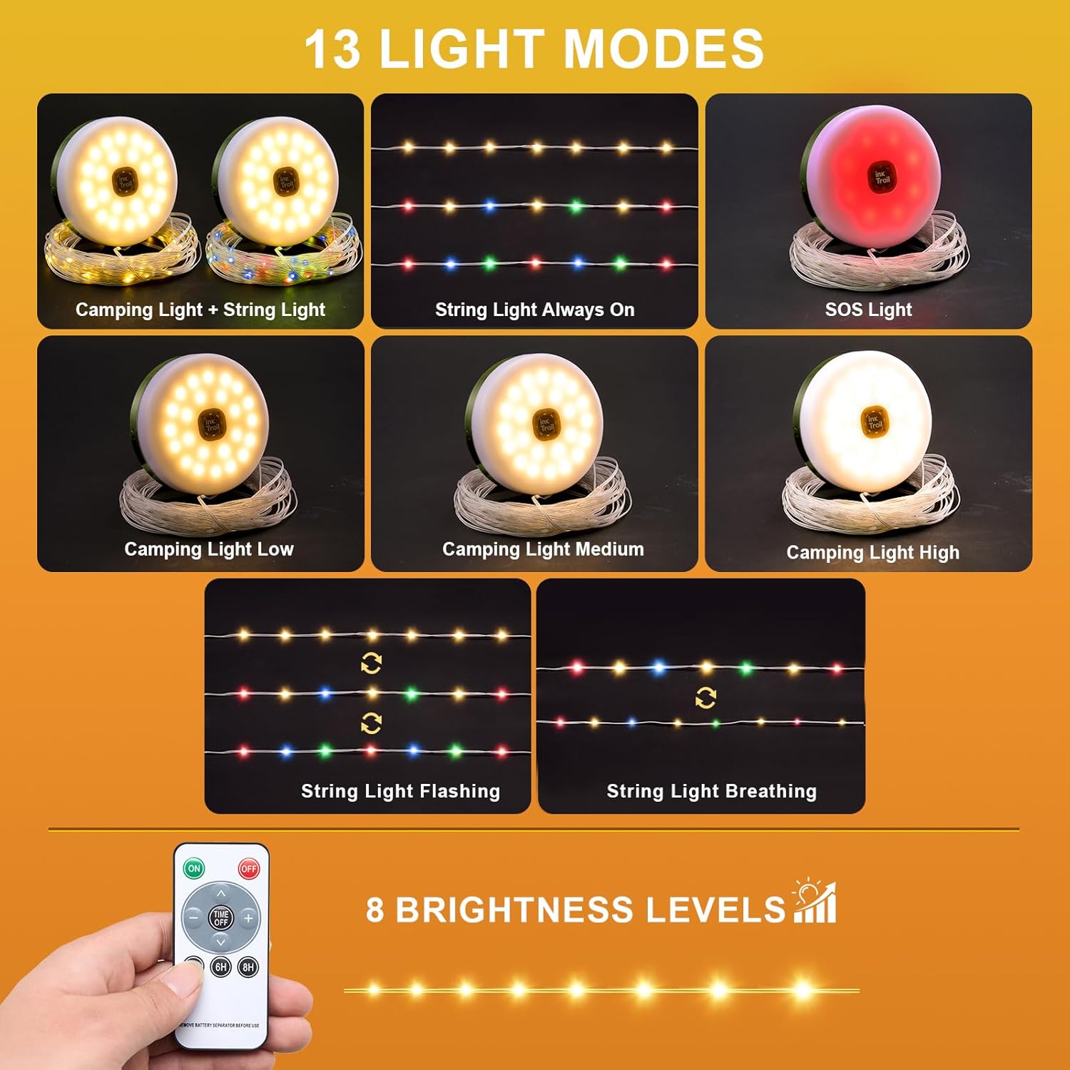 - 13 Light Modes + 8 Brightness Levels: Our outdoor string light has both warm white and multicolored LED lights. It has 13 different lighting modes which can be remote-controlle, combining both constant as well as flashing warm white and RGB lights from the string light and from the camping light, providing the perfect ambience for every occasion. The lights are also dimmbale and you can adjust between 8 brightness levels using the remote.
