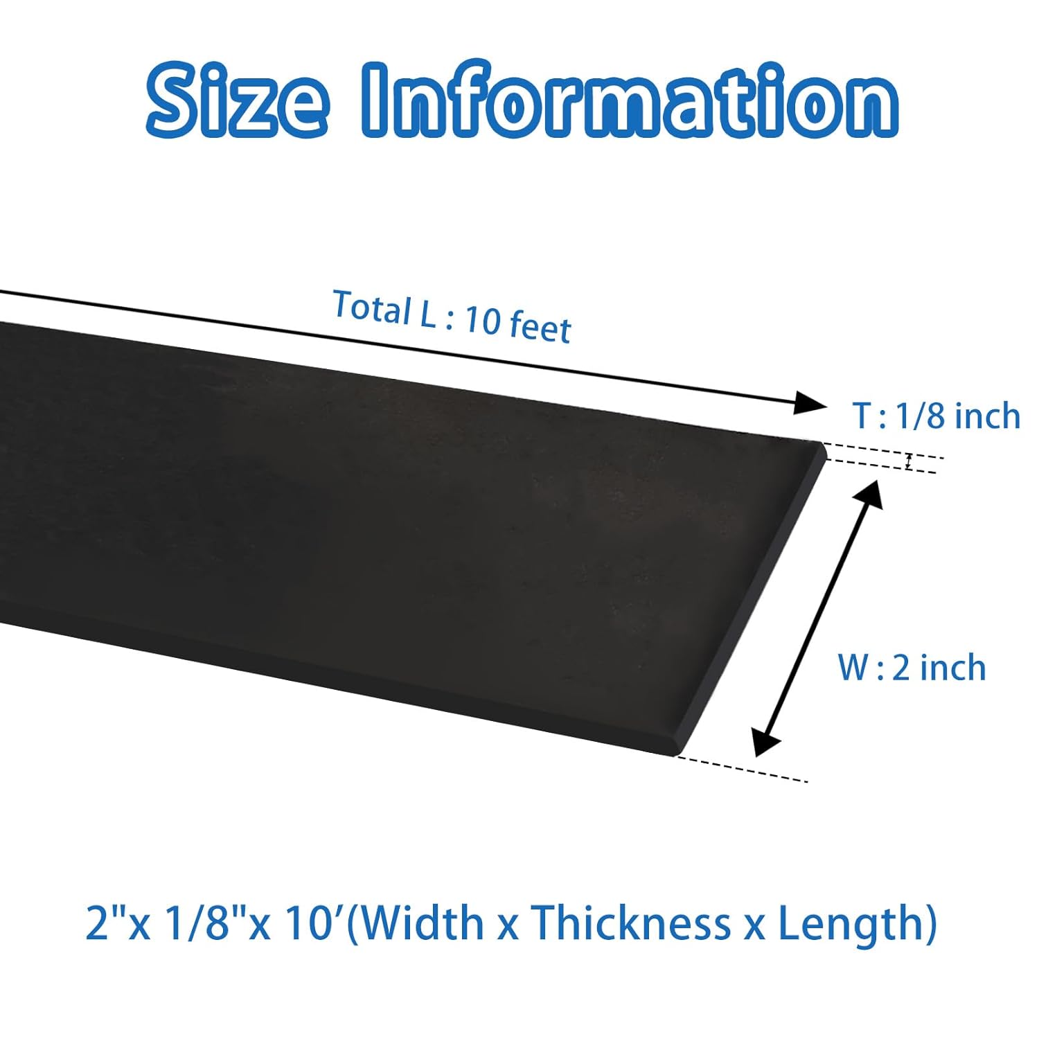 - Size information: The rubber strip is 10 feet in length, 2 inches in width, and 1/8 (.125) inches in thickness.
