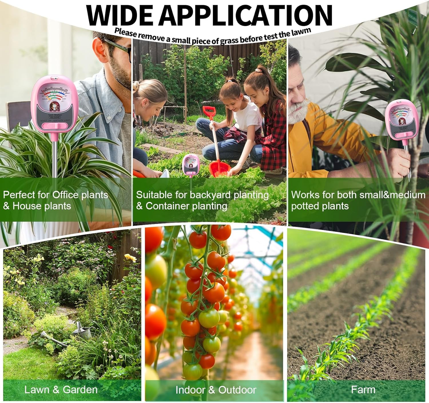 - 4 METER IN 1 COMPREHENSIVE GUIDANCE - 4-in -1 soil test kit with soil moisture meter/soil pH meter/nutrient/sunlight meter. It can meet your needs for measuring soil pH, soil nutrients, sunlight&soil moisture level with a single button. The accurate results can be displayed clearly on the oversized dial immediately. Provides precise care guidance for plants to thrive, based on soil test results for soil moisture/soil pH. Larger and clearer dial, easy to use