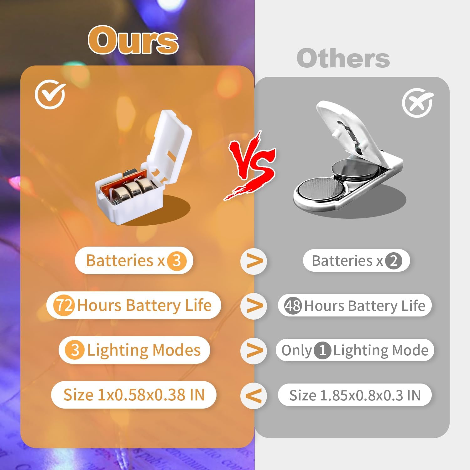 - Long-Lasting Battery Life:Equipped with 3 pre-installed batteries and Crafted with high-quality strong silver wire and energy-efficient LED bulbs,allow the mini fairy lights stay lit for more than 72 hours.