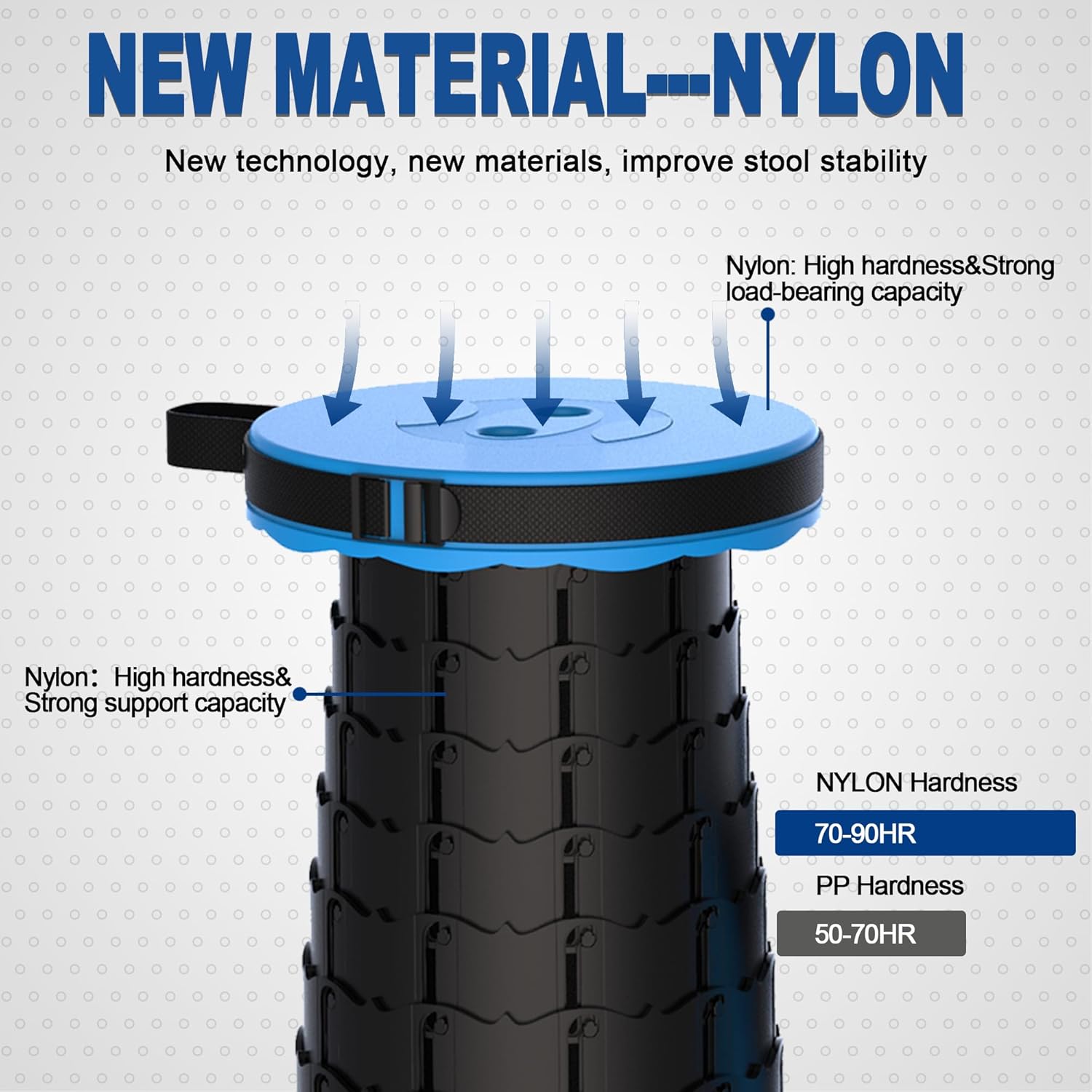 - NEWEST Material---Portable stool with NYLON material and fish scale structure, NYLON's hardness reaches to 70-90HR, which means there is a remarkable improvemenmt in strength and sturdy. The maximum load capacity of nylon telescopic stool reaches to 500lbs.