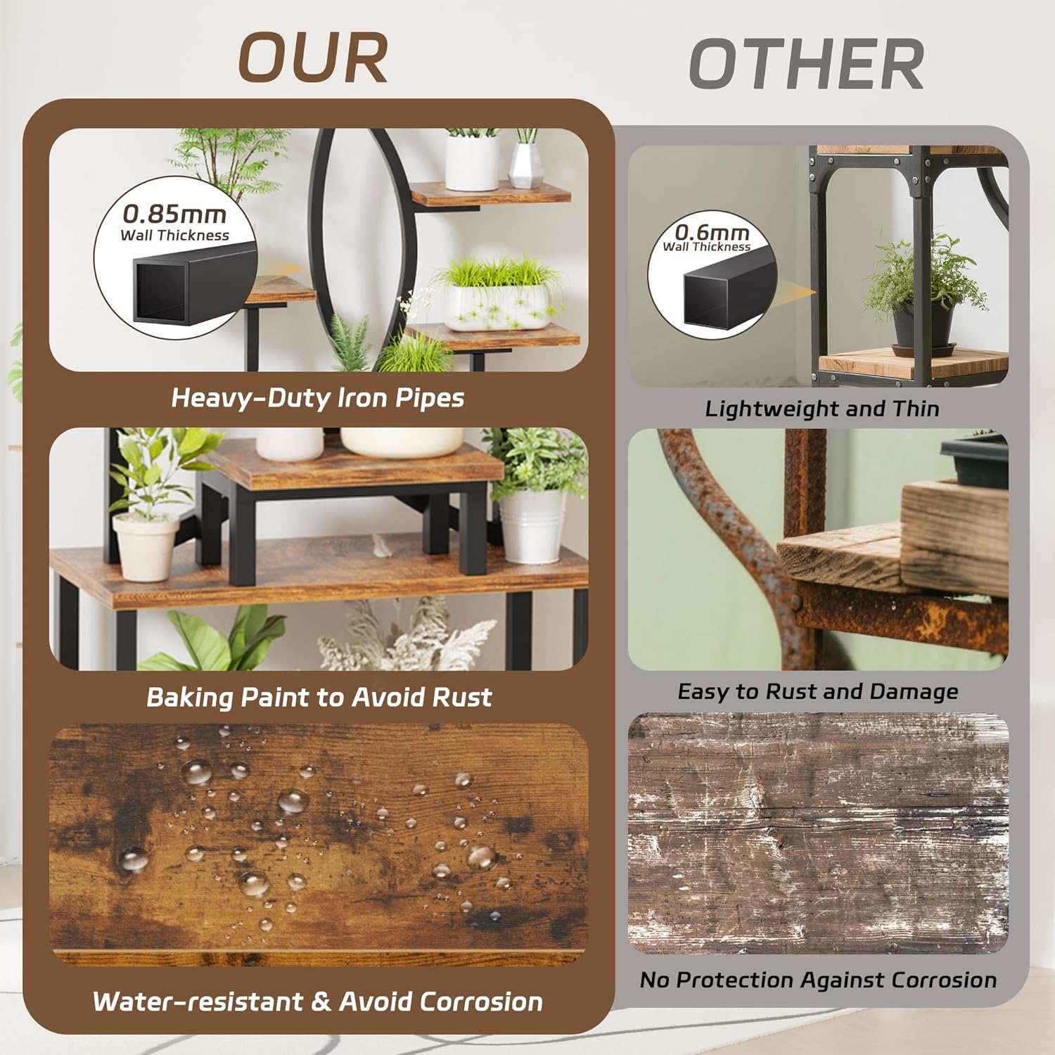 - Stable and Sturdy: Crafted with a 0.85mm thick iron frame and an integrated structure, this plant light shelf is both stable and heavy-duty. The powder-coated finish prevents rust, while the thickened waterproof panels resist warping and make cleaning easy. This makes it a reliable choice for those seeking a long-lasting shelf with grow lights or grow shelves with lights.