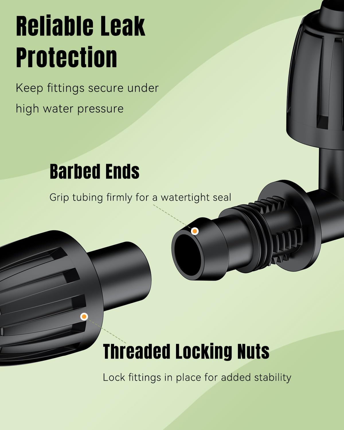 - Secure Leak Protection: Its dripless barbed ends firmly grip tubing for a snug, watertight connection. And the threaded locking nuts add extra security, reliably preventing slipping, leaks, and bursts under high pressure