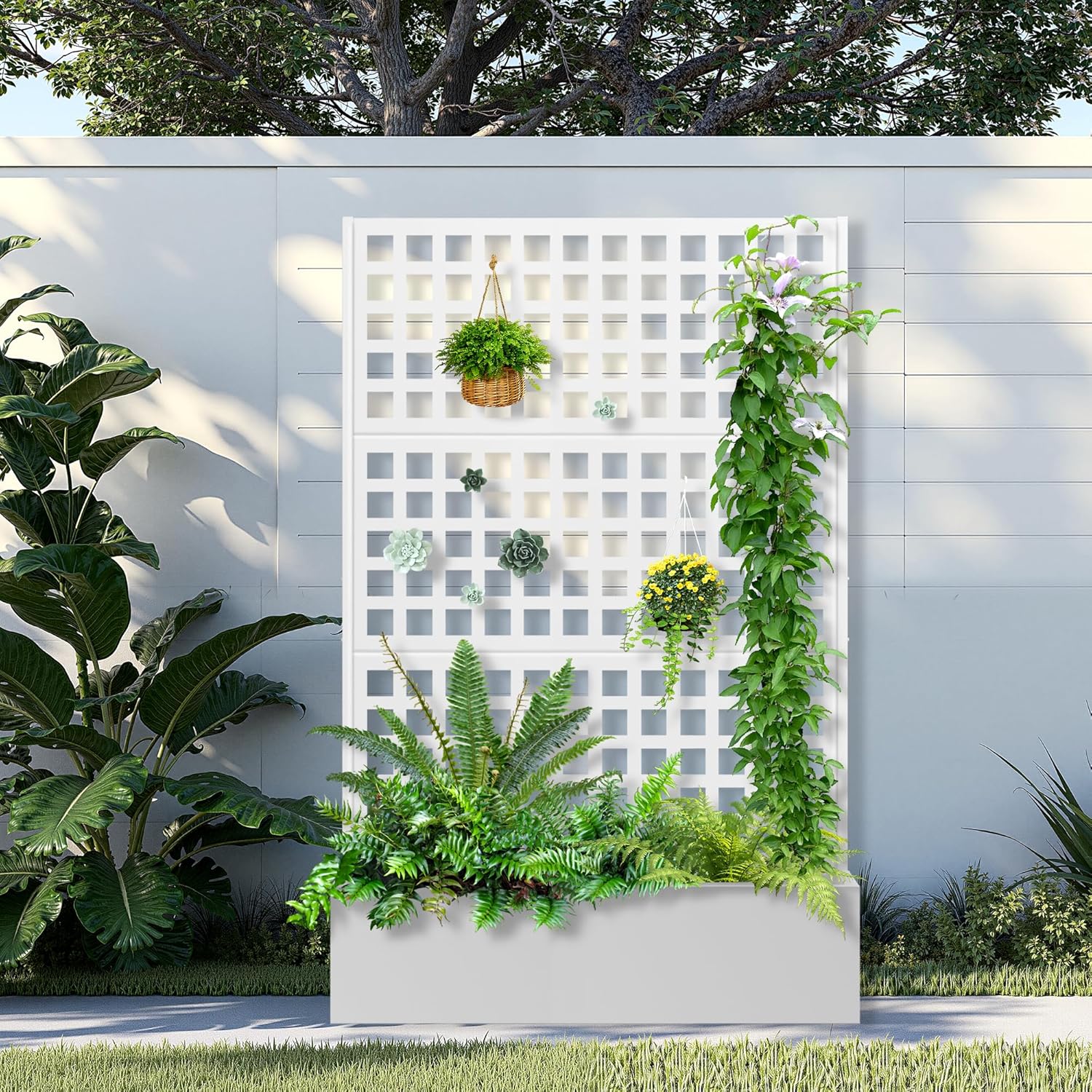 Metal Raised Garden Bed with Trellis, 2 in 1 Trellis with Planter Box & Privacy Screen for Climbing Plants, Vine, Outdoor Standing Flower Beds with Drainage Holes, 47.2"L x 16.7"W x 70.8"H, White