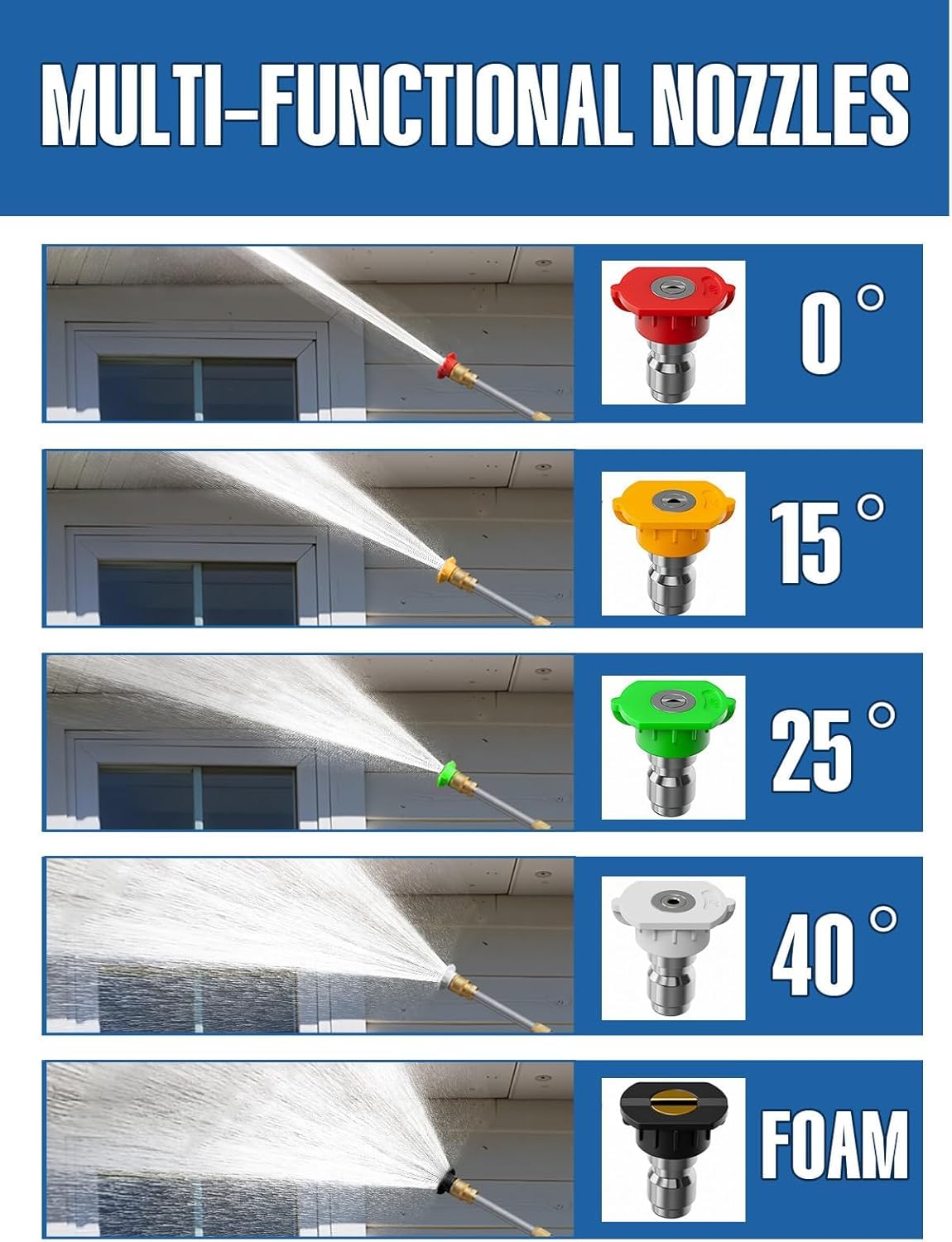 - MULTI-FUNCTIONAL NOZZLES: The water hose nozzle high pressure is equipped with 5 switchable nozzles, 0° high-pressure water jet is suitable for cleaning moss in the floor cracks, 15° can be used for car wash, 25° nozzle - ground cleaning, 40° - window cleaning, 60 ° - yard dusting, easy to deal with the whole scene.
