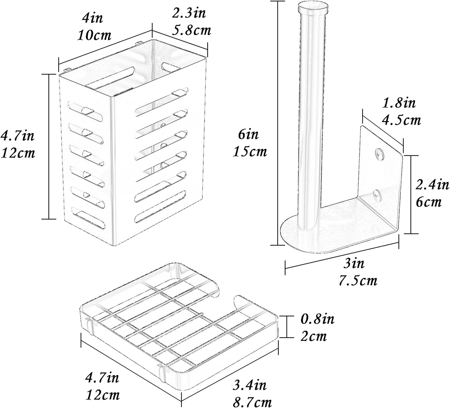 - Included Components : 1 Soap Holder, 1 Tissue Holder, 1 Utensil Holder, 2 Adhesives, 2 Hanging Storage Baskets