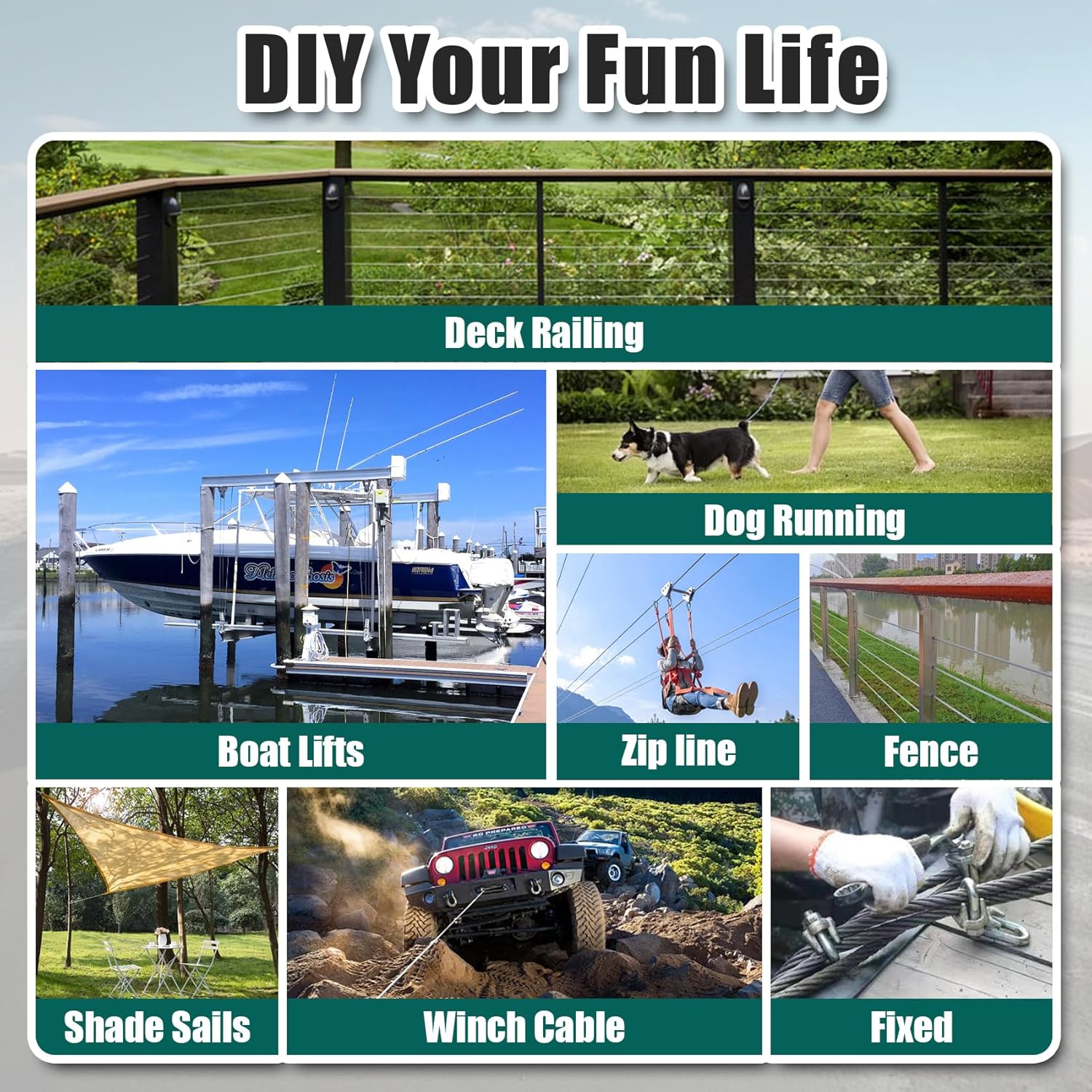 - Flexible structure: Stainless steel cable adopts a 7x19 strand structure, 6400 pounds of super load-bearing capacity, and can be freely cut to length.