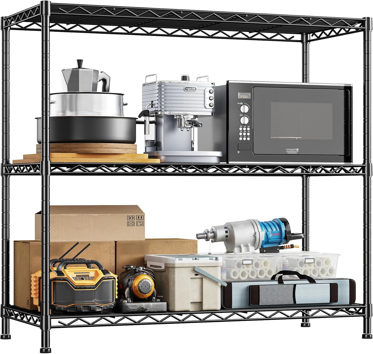 - Made of Commercial-Grade Metal Shelving Material: The wire shelf is constructed of strength steel tubing for added strength and durability, which can withstand rigorous use to ensure long-lasting stability for home, garage or industrial storage. Each shelf holds 155 lbs. evenly; 465 lbs. total.