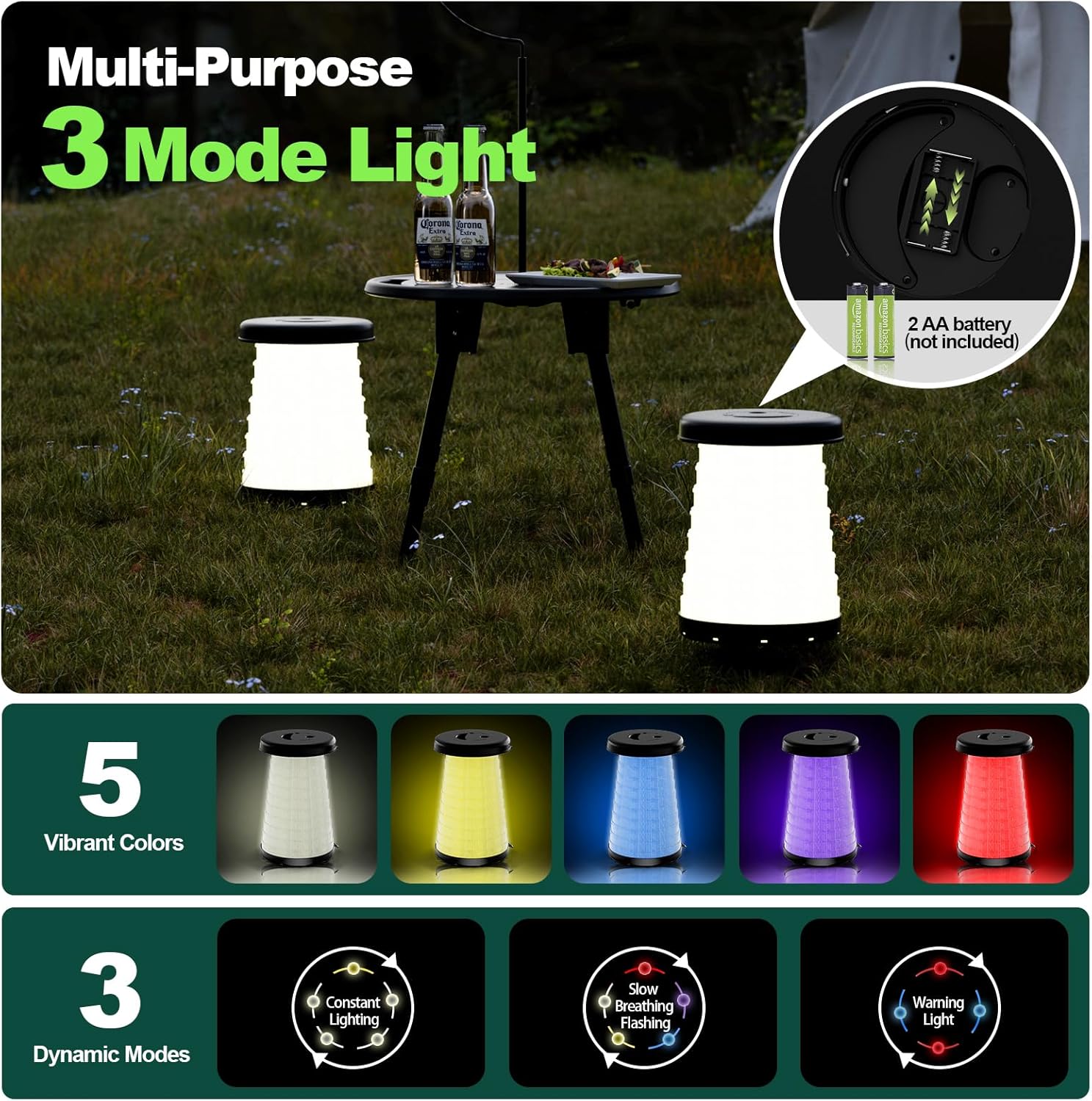 - 【Smart LED Camping Stool】Features a built-in 3-mode LED light: ① Warm White (24h illumination) for nighttime camping, ② Breathing Gradient (mood lighting) for backyard gatherings, and ③ Red/Blue Flash (emergency signaling) for survival situations. Easily control all modes with the top-mounted button (requires 2 AA batteries, not included).