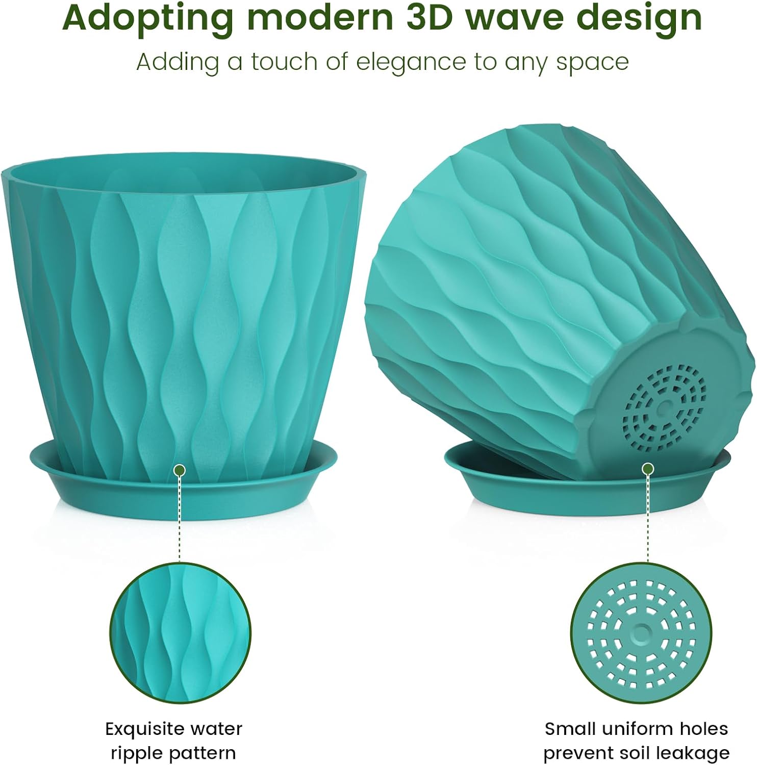 7 inch Plant Pots for Indoor Outdoor Plants, 5 Pack Thick Flower Pots with Drainage Holes and Saucers, 3D Modern Wave Texture Plastic Planter Pots for Nursery and House Plants, Blue Green