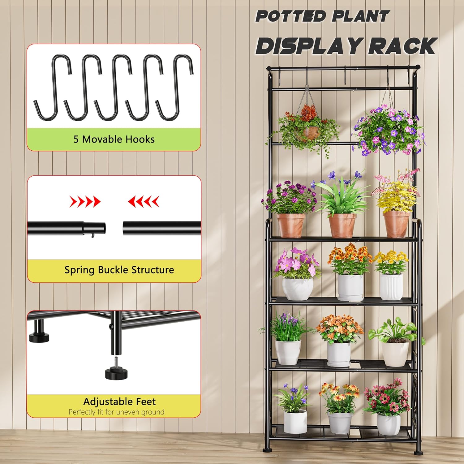 Plant Stand Indoor Outdoor Heavy Duty Metal - 68.4" Tall 4-Tier Shelf for Multiple Plants, Flowers, Rustproof Black Storage Rack for Patio, Balcony, Living Room, Garden, Includes Hooks&Adjustable Feet