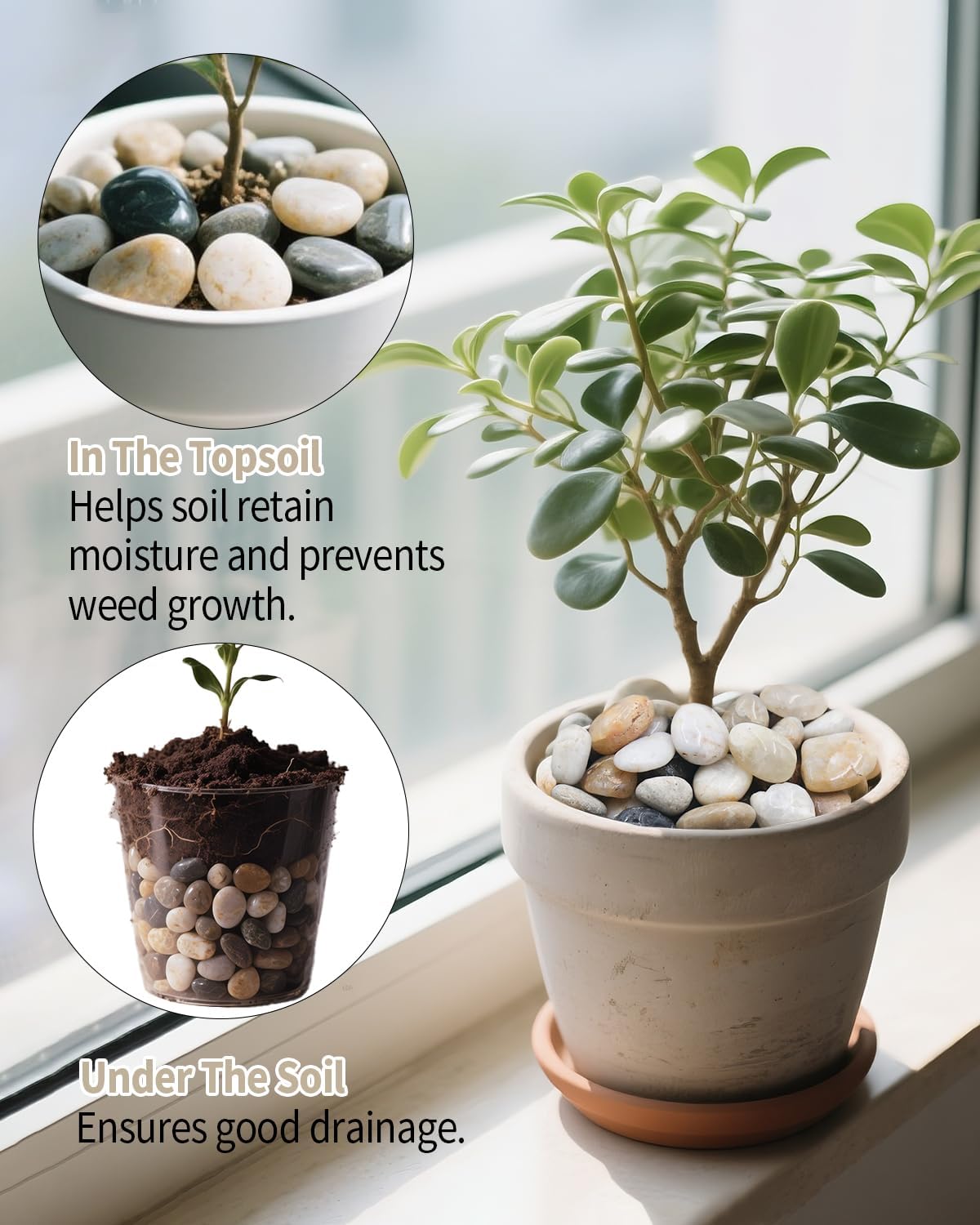 - 2.5 LB Natural Polished River Rocks (5/16"-5/8"):Includes approx 120 smooth, rounded stones perfect for decorative landscaping, plant pots, and DIY projects. Uniform size ensures consistent coverage for gardens, walkways, and indoor decor