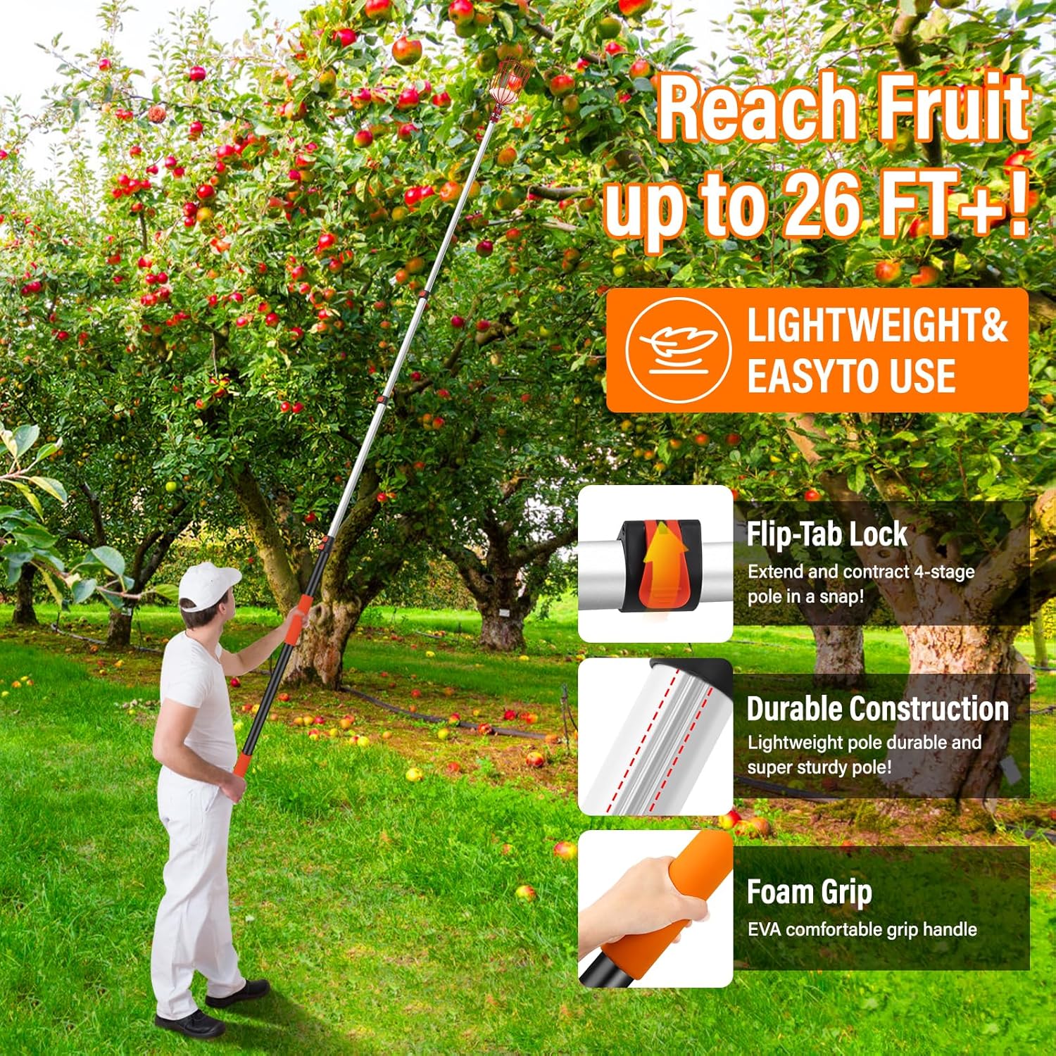 26FT Reach Fruit Picker Pole with Basket Telescoping,Apple Picker Pole with Basket,Lightweight Aluminum Pole Fruit Catcher for Trees,Orange Picker Suit for,Pear,Lemon,Mango,Guava,Avocados