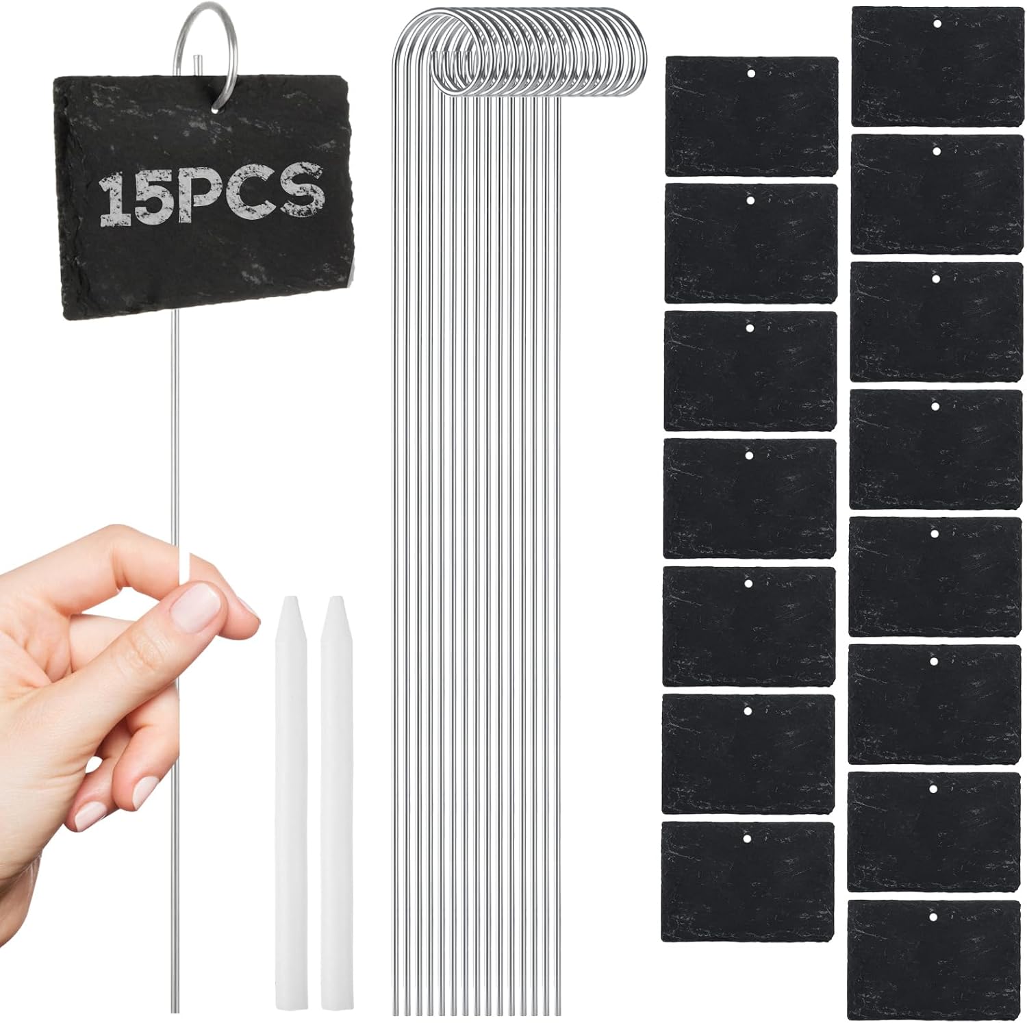 15PCS Slate Plant Markers with Stakes and Stone Chalks Garden Markers Signs Labels Hanging Slate Planter Tags for Flower Bed, Pots, Planters